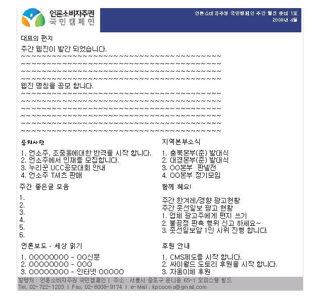 서울본부의 바람예감님의 의견을 받아 드려 언소주의 소식을 알리는 주간 웹진을 발간 하려고 합니다.