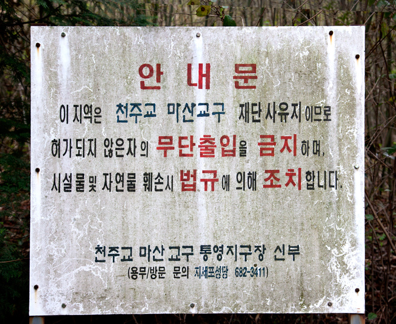 구대청을 둘러싸고 있는 산은 천주교 마산교구청의 산지이며 일부는 박문길관세사의 산지로 얼마 전 윤무부교수가 새공원을 하게 되면 자기 산을 3만평 기부하겠다는 기사가 난적이 있다. 새공원 조성은 물 건너 간 것 같고, 천주교 부지는 마산교구청에서 박봉문 순교자의 순례지를 만든다고 하나 얼마나 진행되고 있는지는 알 길이 없다.