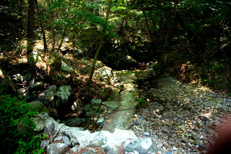이곳부터는 깊은 계곡이다. 옛 농토에는 잡풀이 우거져 다시 야산으로 변하고 있다. 더운 날씨이긴 하나 숲길은 그늘이 있어 햇빛이 막아주고, 숲길은 적당하게 잡초들이 되어있어 걷기에는 아주 좋다. 그런데 고랑에 흐르는 물이 그리 많지가 않다. 어찌된 영문인지 생각해보니 아마 용바위 부근에 식수원으로 쓸 요랑으로 물을 끌어 당겨 가는 영향으로 여겨진다. 이를 확인하기 위해 고랑을 따라 올라가보니 역시 물이 많지가 않다. 왜 그런가?