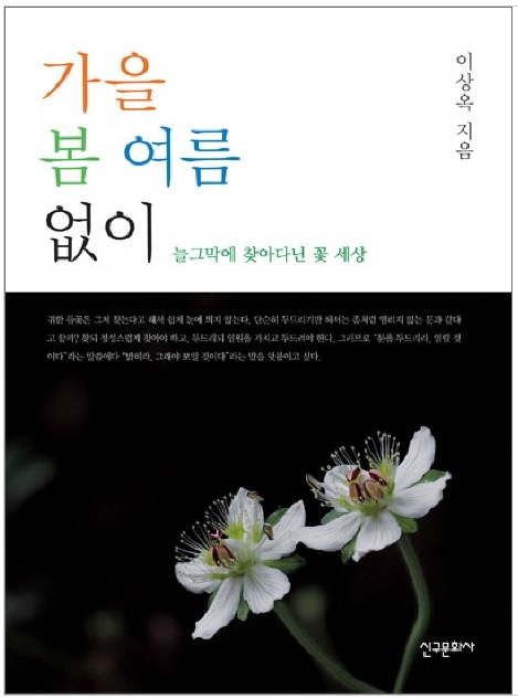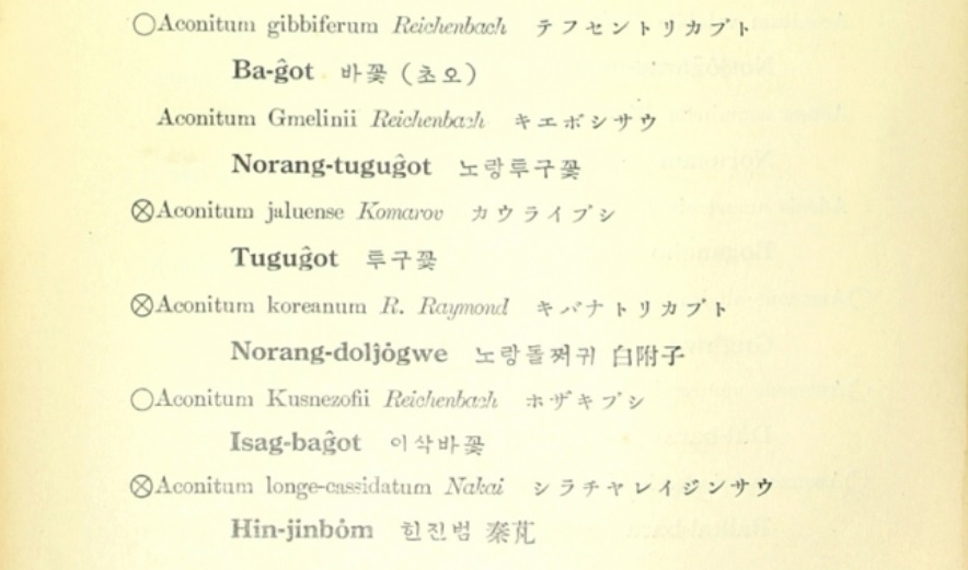 | 투구꽃 그 이름에 대하여...화우 ## 월류봉 선생님의 <가을 봄 여름 없이> # 제11회 <한국의 야생화 사진전>과 월류봉 선생님 <화우의 야단법석 꽃이야기>를 연재하게 된 인연들 중에 나름 화우가 생각하는 인연의 하나는 월류봉 이상옥 선생님이다. 그렇다고 제가 선생님에게 가르침을 받은 적도, 안타깝게도 직접 뵙지도 못하였다. 어쩌다 지난해 많은 인디칸들을 뵐 수 있는 기회로 생각하고 기다렸던 제11회 <한국의 야생화 사진전> 은 '독감'이라는 돌출변수를 만나 '타미플루'를 씹으면서 스스로 격리해야 했다. 전시회 시작과 마지막에 번개처럼 잠시 들러 전시된 작품들을 겨우 일별하고 만족해야 했다. 월류봉 선생님의 작품도 살펴볼 수 있었다. 전체적으로 아쉽고도 아쉬웠다. * 월류봉 선생님을 찍어주신 분을 알지 못해 저작권 표시를 못했습니다. 알려주시면 수정토록 하겠습니다. 더 아쉬운 것은 인디칸데이에 월류봉 선생님이 직접 나오셨다는 사실이다. 사진을 보면서 언젠가 뵐 수 있는 그날까지 선생님 늘 건강하시기를 빈다. 참, 인연의 구체적 설명을 안했다. 그것은 바로 <월류재통신> 이라는 삶의향기란에 연재되었던 인디칸들에게 글읽는 재미를 톡톡히 주었을 바로 그 글을 제가 접했기 때문이다(월류재통신은 지금도 삶의향기란에서 검색이 가능하다). ⓒ 멋과사랑, 제11회 인디칸데이, 월류봉 선생님 축사 소재, 꽃경험, 표현력, 문장력 등 어디 하나 도저히 따라갈 수 없겠지만 <월류재통신>을 읽으며 '꽃이야기' 라는 구상을 할 수 있었다. 열심히 홈페이지에 올라온 글들을 보던 어느날 실린 글들이 책으로도 나와 있 었다는 소식을 들었다. 안 찾아볼 수가 없었다. 책을 손에 넣었을 때의 기쁨을 무엇이라 해야 할까. 지금도 늘 꽃이야기 쓰는 가까이에 이 책이 꼽혀 있다. <이상옥, 가을 봄 여름 없이 - 늘그막에 찾아다닌 꽃 세상, 신구문화사, 2010> 제가 엄청 좋아하는 물매화 사진을 표지로 쓴 이 책은 여전히 인터넷 서점을 통하여 구할 수 있는 것으로 보인다. 혹시나 꽃과 삶, 탐화(探花)에 대한 기록에 대하여 관심이 있으신 분들은 꽃 한 번은 읽어 보았으 면 좋겠다. # 월류봉의 투구꽃 투구꽃 꽃이름의 유래에 대한 꽃이야기를 하면서 왜 월류봉 선생님의 얘기를 먼저 했는지 궁금할 것이다. 선생님이 금번 전시회에 제출한 작품 중에 투구꽃 사진이 한 장 있었다. 아래 사진이 선생님 작품이다. ⓒ 월류봉, 투구꽃, 아코니툼 얄루엔세 Aconitum jaluense Kom. 선생님의 저서 2부는 월류재통신에 올려주신 글들을 정리한 것인데, 투구꽃에 대한 얘기가 몇 줄 나온다. 그 글에 오류가 있어서 혹시나 다른 분들이 책을 읽을 때 오해가 없었으면 하여 꽃이야기로 지적을 해 놓는 다. 월류봉 선생님, 이렇게 지적해 놓아도 괜찮지요. 용서해 주실꺼죠. 그 글 내용은 '일본어에서 따온 꽃이름들'이라는 제목 아래, 여러 일본어 영향을 직간접으로 받은 것으로 생각되는 여러 우리 꽃이름들이 소재가 되어 쓰여졌다. 제가 꽃이야기로 하는 작업의 일부는 <조선식물 향명집, 1937>에서부터 시작된(그래서 명명한 것으로 생각되는) 꽃이름들에 대하여 제자리를 찾아주는 것이다. 오늘 글도 그런 방향의 꽃이야기가 될 것 같다. 선생님 글을 옮겨본다. 인디카 <월류재통신>으로 보실려면 아래를 클릭하여 보시기 바란다. '식물의 이름표(3) - 월류재통(17)' http://www.indica.or.kr/xe/people/2389579 "한편 투구꽃은 일어로 '코라이부시'네요. 한자로는 古來武士가 아닐까 싶습니다. 그러므로 우리가 투구꽃 이라는 이름을 붙이게 된 연유도 바로 이 일어명에 있을 것이라는 생각이 듭니다. 저는 투구꽃을 볼 때마다 고대 로마 군인들의 청동 투구를 생각합니다만, '투구꽃'이라는 이름을 먼저 알게 되었기에 이런 연상도 가능하지 않았을까 싶습니다. 그런 선입견이 없다면 이 꽃에서 무엇을 연상했을까요?" 투구꽃 - 일본 꽃이름 '코라이부시' - 古來武士 (-일본무사 - 투구 - 투구이미지의 꽃이름 투사 - 투구꽃) 이다. 꼭 이런 식은 아니지만 우리 꽃이름의 유래에 대한 추정적인 설명에는 이런 구조적 이해가 따른다. 아이디카 이재능 선배님의 <꽃들이 나에게 들려준 이야기01, 2014>의 '투구꽃' 이야기도 비슷하다. "'투구꽃'이라는 이름은 물론 투구를 닯아서 그리 불렀겠지만, 아무래도 일본 식물명에서 따온 것이지 싶다. 이는 옛날 일본 장군들이 쓰던 투구가 우리의 투구보다 더 투구꽃의 모습과 비슷한 것에서도 알 수 있다. 그나마 수순한 우리말인 '바꽃', '돌쩌귀', '놋젓가락'이 13가지 종의 이름으로 쓰이고 있으니 다행 이다. 나는 우리의 투구보다 일본 투구의 모양을 더 닮은 이 꽃을 '투구꽃'이라고 부르는 일이 별로 유쾌 하지는 않다." ## 투구꽃 꽃이름의 유래 # 투구꽃의 학명 투구꽃은 미나리아재비과 식물로 속의 대표식물이다. 속명은 아코니툼(Aconitum)이라고 쓰는데, 우리말 속명은 아시다시피 '투구꽃속'이라고 부른다. 예전에 '바꽃속' 또는 '초오속'이라고도 불렸다. 우리 꽃이름 투구꽃의 학명은 아코니툼 얄루엔세(Aconitum jaluense)를 쓴다. 속명 아코니툼(Aconitum)의 의미에 대하여는 여러 설이 있다. 어원불명(語源不明)의 그리스