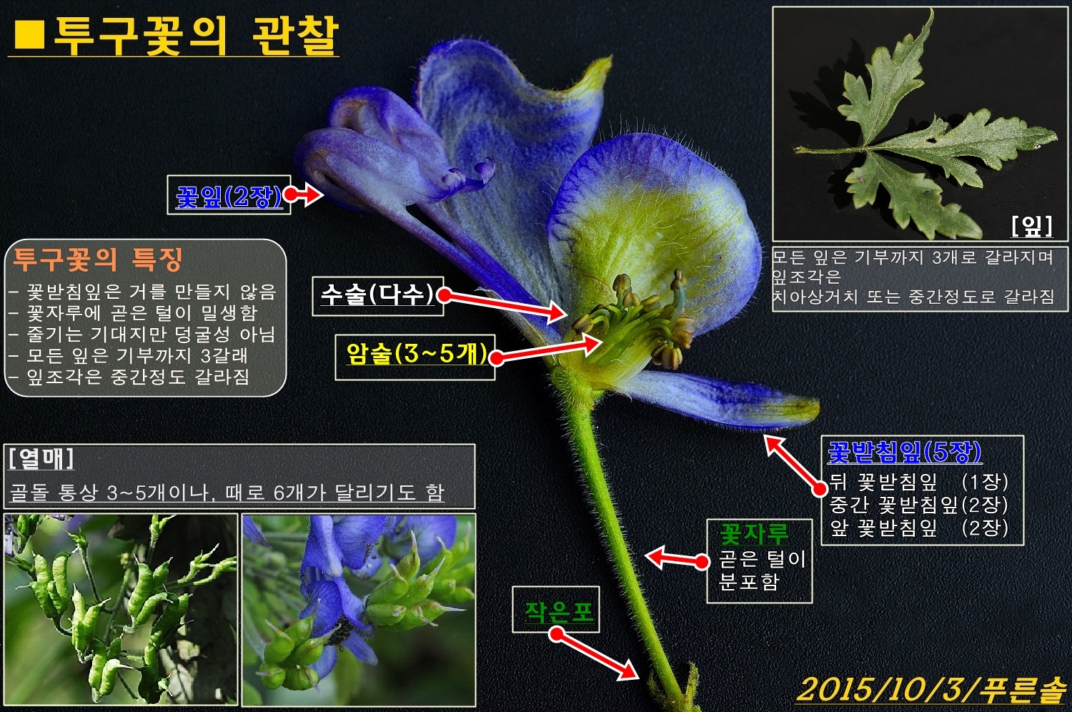 | ♣ 투구꽃이란 무었인가? 가을을 대표하는 꽃은 구절초와 쑥부쟁이 그리고 해국 등이 있는데 산기슭에 가면 자주색을 띤 투구꽃을 만난다. 옛날 초등학교 다닐 때에 어느 농부집에서 투구꽃을 나물로 무쳐 먹다가 중독이 되어 고생하는 것을 본 적이 있다. 그만큼 초오속식물들은 맹독성이다. 나라에 잘못을 저질러 賜藥을 내렸는데, 그 재료가 초오속식물과 천남성이 주로 사용되었다. 그럼 투구꽃이란 무엇인가? 인터넷 상에는 다양한 이름이 상존한다. 투구꽃은 미나리아제비과 초오속식물이다. 草烏란 말은 투구꽃을 한방에서 쓰는 말이다. 烏頭, 川鳥, 草烏, 草烏頭, 川鳥頭, 附子, 白附子, 秦艽, 秦范, 바꽃, 準烏, 烏喙, 天雄, 附子, 側子등은 모두 한방에서 사용하는 말이다. 옛 서적 광재물보, 물명고, 동의보감에서는 초오, 놋져나물,바꽃 등으로 표현되고 있으며, 향명으로는 바꽃, 돌쩌귀,투구꽃, 놋젓가락나물,진범,오독도기 등13가지 정도나 된다. 현대의학이 발달되기전에는 산에서 나는 천연식물을 재료로 한방에서 다려 먹었는데 그 중에서 감초가 많이 사용되었다. 그리고 독초라고 하는 천남성이나 투구꽃을 더러 사용하였다. 맹독성 식물은 잘 사용하면 生藥이 되나 잘못사용하면 死藥이 된다. 투구꽃 종류는 맹독성 식물이므로 함부로 약으로 사용하면 안된다. ♣ 투두꽃 종류의 어원 미나리아재비과 초오속식물(진범아속, 초오아속)은 북반구의 온대와 아한대에 약250여종 우리나라에는 18종(일부 40종)자생하고 있다. 초오란 한방에서 초오속식물에는 바꽃, 돌쩌귀, 진교, 투구꽃 등이 포함되어 있으며 우리들이 흔히 볼 수 있는 꽃은 투구꽃(초오)이다. ◉투구꽃 : 투구꽃이란 옛날 병사들이 쓰고 있는 투구의 모습과 닮았다고 하여 붙여진 이름이다. 草烏라고도 하는데 이는 뿌리가 까마귀 머리와 같다하여 붙여진 이름이다. ◉ 진범(진교): 진교(秦艽)-진봉(秦芃)-진범(秦范), 진나라에서 뿌리가 서로 얽혀있는 풀이라 해서 궁벽할교를 써서 秦芃이라 하였는데 조선시대 잘못 표기하여 진범(陳范)으로 읽어왔다. 우리나라 옛 이름은 ‘오독도기’이다. 한문으로 번역하니 진범(秦范)이되었다. 진교(秦艽)는 큰잎용담으로 진범과는 다른 식물이다. -오독도기(오돌또기): 오독도기에 대한 자세한 어원은 없으나 제주민요 오돌또기에 나오는 할미꽃을 닮은 데서 유래한 것일까? ◉돌쩌귀: 한옥에서 여닫이문에 다는 경첩. 꽃과 열매의 모양이 한옥의 문을 열고 닫는 경첩의 모양을 닮았다고 하여 이름지어졌다고 하나 별로 수긍이 가지 않는다. ◉바꽃: 바위가 많은 곳에 자생한다고 하여 붙여진 이름이다. 더러는 덩이뿌리가 송곳처럼 뾰족하다 하여 부쳐진 이름이라고 한다. ◉ 노젓가락나물: 선덩굴바꽃이라고도 하며 봄에 새싹을 데쳐서 말리거나 갈무리했다가 묵은나물로 먹을거리로 한다. 노적가락을 닮았다고 하나 수긍이 가지 않는다. 전초.뿌리는 독이 있으나 새싹은 독이 없다. - 烏는 뿌리가 까마귀 머리와 같다고 하여 붙여진 이름이다. ( 烏頭, 川鳥, 草烏, 草烏頭, 川鳥頭 ) - 川은 사천지방에서 나는 투구꽃이 우수하다고 하여 붙여진 이름이다. (川鳥, 川鳥頭) - 附子는 투구꽃 뿌리를 말하며 그냥 말린 것은 生附子, 白附子는 소금물에 말려서 사용한 것, 土附子 는 더운물로 가열한 것을 말한다. 약방에서 많이 사용한다.일반적으로 母根은 草烏, 子根은 附子라 한다. | |