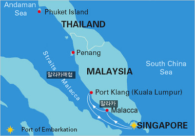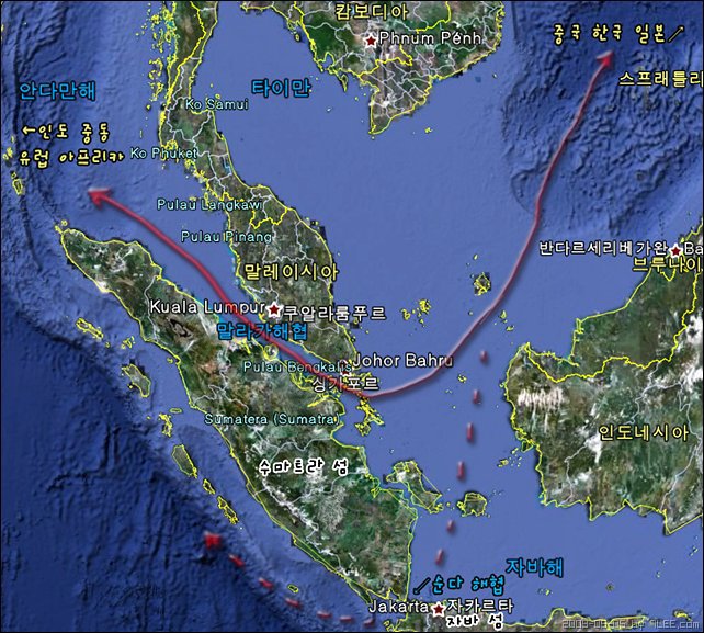 말라카해협 | 인도네시아 스마트라섬과 말레이시아 말카 해협을 말하며 약800km이른다. 우리나라는 석유의 대부분을 중동으로부터 수입해요. 석유를 가득 싣고 페르시아만에서 출발한 유조선은 말라카 해협을 지나 한국에 도착합니다. 말라카 해협은 말레이반도와 인도네시아 수마트라 섬 사이에 형성된 좁은 해협으로, 서쪽은 인도양, 동쪽은 남중국해와 연결돼 있어요. 오래전부터 동방과 서방을 연결해 온 해상 운송로였으며, 지금도 전 세계 해상 운송량의 20% 이상이 통과하는 중요한 바닷길이에요. 말라카 해협은 또 다양한 문명이 교류하던 통로였어요.