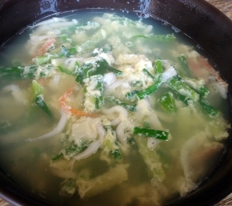 1) 무 넣고 멸치 다시 물을 만들어서 된장 풀고 끓인다. 2)국물이 끓으면 병아리와 시금치 넣고 끓인다. 3)마지막으로 계란과 파 넣고 살짝 끓여 먹는다.