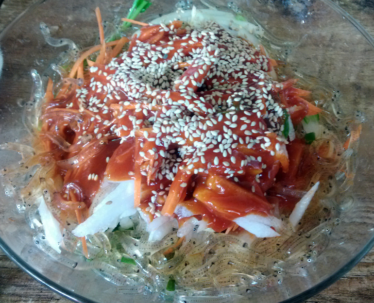-주의: 초장을 넣자마자 재빨리 접시로 대접을 덮어야 한다. 잠깐이라도 방심하면 사백어의 마지막 발악에 온몸이 초장으로 물든다. 따로 비빌 필요도 없다. 사백어들끼리 알아서 초무침을 만들어 준다. 3~4분이 지난 뒤 뚜껑을 열면 맛있는 사백어 무침을 맛볼 수 있다.