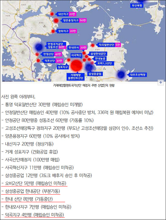 대책위는 거제 같은 경우 ‘성포지구(건화공업 휴업), 사곡혁신지구 11만평(매립승인 미착공), 삼성중공업 12만평(3도크 배후지 승인 후 미착공), 오비2산단 5만평(매립승인 미착공), 삼성중공업 한내공단(부분가동), 한내산단 8만평(가동중단), 한내모사지구 7만평(매립승인 미착공), 덕곡지구 4만평(매립승인 미착공)’ 등을 표시했다.