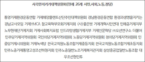 사곡만지키기대책위원회 측은 ‘대책위’에 26개 시민‧사회‧노동‧정당이 참여하고 있다고 밝혔다. 통영거제환경운동연합, 거제해양플랜트산단주민대책위원회, 경남환경운동연합, 환경과생명을지키는 경남교사모임, 거제YMCA, 참교육학부모회거제지회, (사)좋은벗, 거제개혁시민연대, 민예총거제지부, 노무현재단거제지회, 거제사회복지포럼, 인드랑생협거제지부, 거제인문학당, (주)오션연구소, 더불어민주당거제지역위원회, 국민의당거제지역위원회, 노동당거제지역위원회, 정의당거제지역위원회, 민중당거제지역위원회, 거제녹색당, 전국교직원노동조합거제중등지회, 전국교직원노동조합거제초등지회, 민주노총거제통영고성조선하청지회, 민주노총일반노조거제복지관지회, 삼성중공업일반노동조합, 대우조선현민투 등이다.