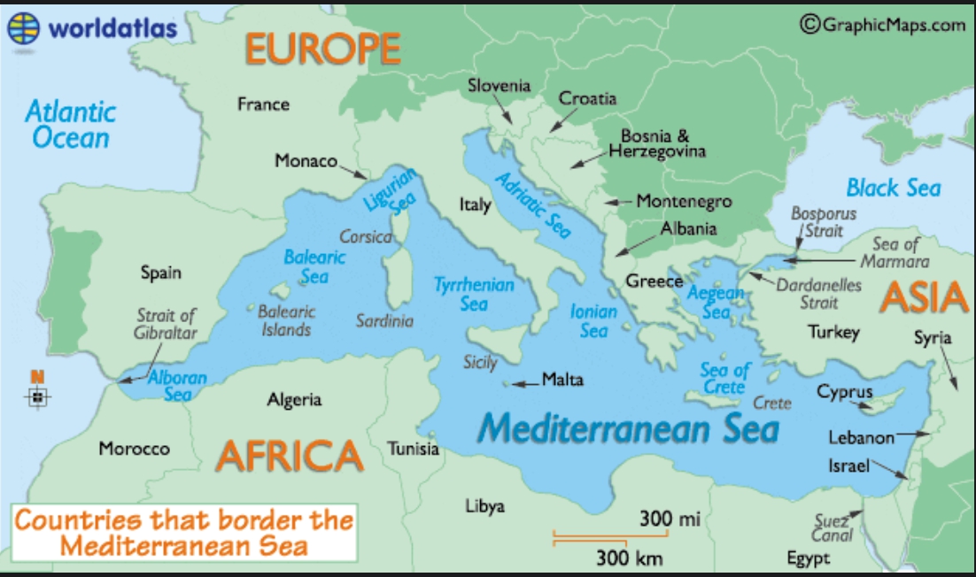 지브롤터,스페인, 프랑스, 모나코, 이탈리아, 몰타, 슬로베니아, 크로아티아, 보스니아-헤르체고비나, 몬테네그로, 알바니아, 그리스, 키프로스, 튀르키예