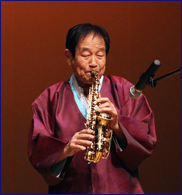 | ▲ 제자 박준영의 공연에서 특별출연하여 색소폰을 연주하는 고 이은관 명인 | ||