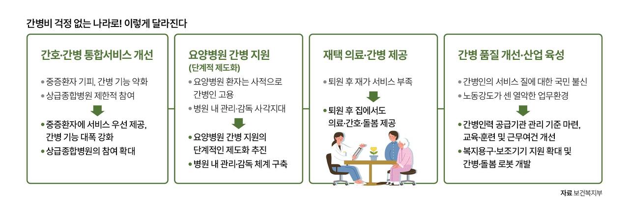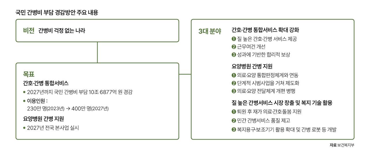 경감방안에서는 이를 더 많은 국민이 부담 없이 이용할 수 있도록 확대·강화했다. 또 정부는 요양병원에서도 간병 지원을 받을 수 있도록 단계적으로 제도화할 방침이다.