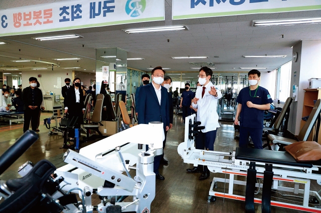 조규홍 보건복지부 장관이 2023년 5월 3일 경기도 성남시 러스크재활병원에서 열린 간호·간병 통합서비스 재활병동 현장 간담회에 앞서 시설을 둘러보고 있다. 사진 보건복지부