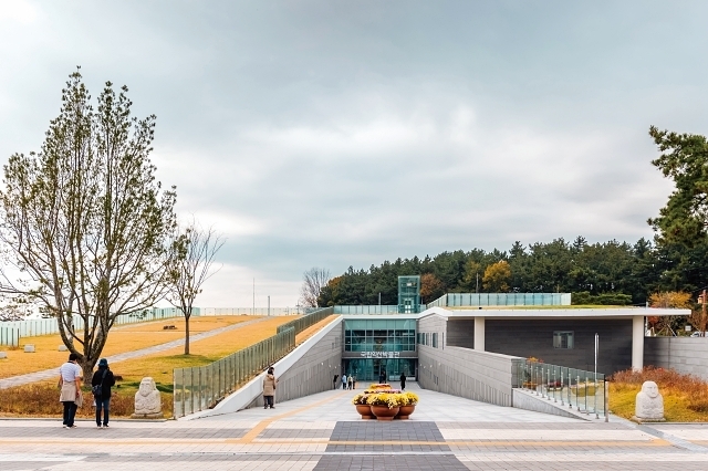 국보 미륵사지 석탑과의 관계를 최우선으로 고려해 시설의 절반 이상을 지하화하는 등 지상 노출을 최소화한 국립익산박물관 입구 전경. 사진 C영상미디어