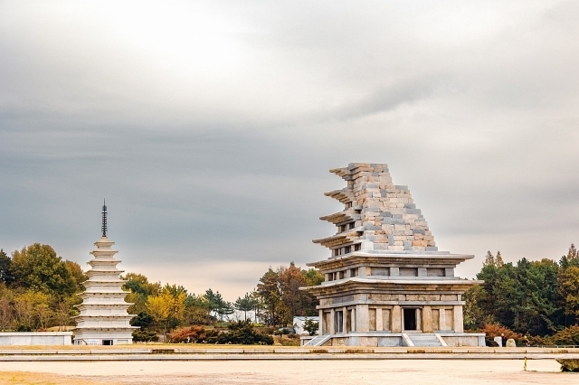 동아시아 최대 규모의 사역을 자랑했던 미륵사지, 그러나 지금은 원형 일부만 남은 미륵사지 석탑(국보, 오른쪽)과 복원된 동원의 구층석탑만 남아 있다.
