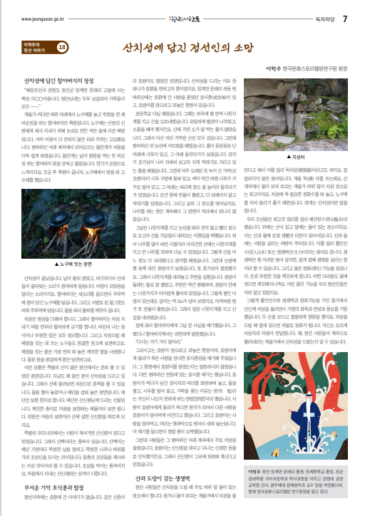 산치성이 끝났습니다. 날이 훤히 밝았고, 여기저기서 산새들이 울부짖는 소리가 청아하게 들립니다. 아침이 되었음을 알리는 소리이지요. 할아버지는 새소리를 들으면서 주루막에 밥이 담긴 노구메를 넣습니다. 그리고 사발로 된 물그릇도 비워 주루막에 담습니다. 물을 떠서 불씨를 깨끗이 끕니다.