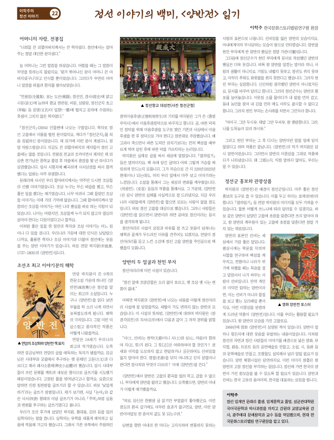 물론 1966년에 최인현 감독이 영화로 만든 <양반전>이 상영된 적이 있습니다. 양반이 얼마나 힘든지에 대한 웃음을 유발하는 내용이었습니다. 이처럼 정선의 자연과 정선 사람들의 이야기를 배경으로 넣은 영화, 뮤지컬, 연극, 팝송, 트로트 등의 공연예술로 만들고, 소설, 시, 동화 등의 문학예술로 만들고, 조형물도 설치해서 널리 알릴 필요가 있습니다. 양반 체험시설은 당연하지요. 이런 이미지 창출은 참 양반의 고장 정선을 부각하는 일입니다. 정선에 가면 한국의 양반이 가진 참모습을 볼 수 있도록 할 필요가 있습니다. 양반과 선비는 한국 고유의 용어이며, 한국을 대표하는 상징을 띱니다.