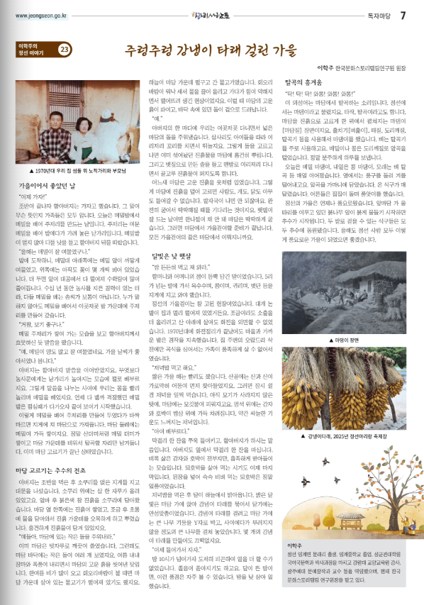정선의 가을은 언제나 풍요로웠습니다. 앞마당 가 울타리를 이루고 있던 붉나무 잎이 붉게 물들기 시작하면 추수가 시작됩니다. 두 발로 걸을 수 있는 식구들은 모두 추수에 동원됐습니다. 올해도 정선 사람 모두 이렇게 풍요로운 가을이 되었으면 좋겠습니다.
