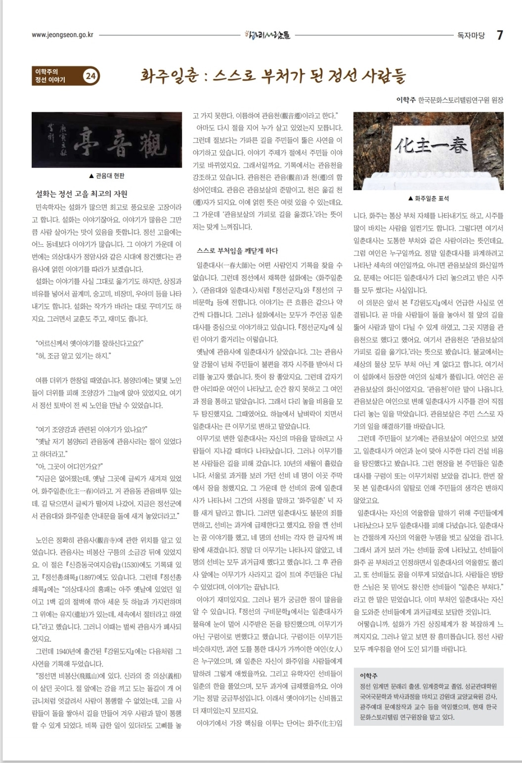 “지금은 없어졌는데, 옛날 그곳에 글씨가 새겨져 있었어. 화주일춘(化主一春)이라고. 거 관음동 관음벼루 있는데. 길 닦으면서 글씨가 떨어져 나갔어. 지금은 정선군에서 관음대와 화주일춘 안내문을 돌에 새겨 놓았더라고.”