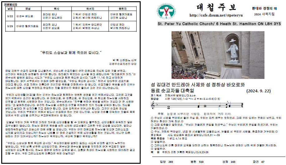 2024-39 성 김대건 안드레아와 성 정하상 바오로 외 순교자 대축일(9/22) 작성자CISCO|작성시간24.09.22|조회수189 목록 댓글 0 글자크기 작게가 글자크기 크게가 2024 39 성 김대건 성 정하상외 순교자.pdf862.46KB 첨부파일첨부된 파일이 3개 있습니다. png 파일 image.png 다운로드 png 파일 image.png 다운로드 pdf 파일 2024 39 성 김대건 성 정하상외 순교자.pdf 다운로드 다음검색 현재 게시글 추가 기능 열기 북마크 공유하기 신고 센터로 신고 댓글 댓글 0 댓글쓰기 답글쓰기 댓글 리스트