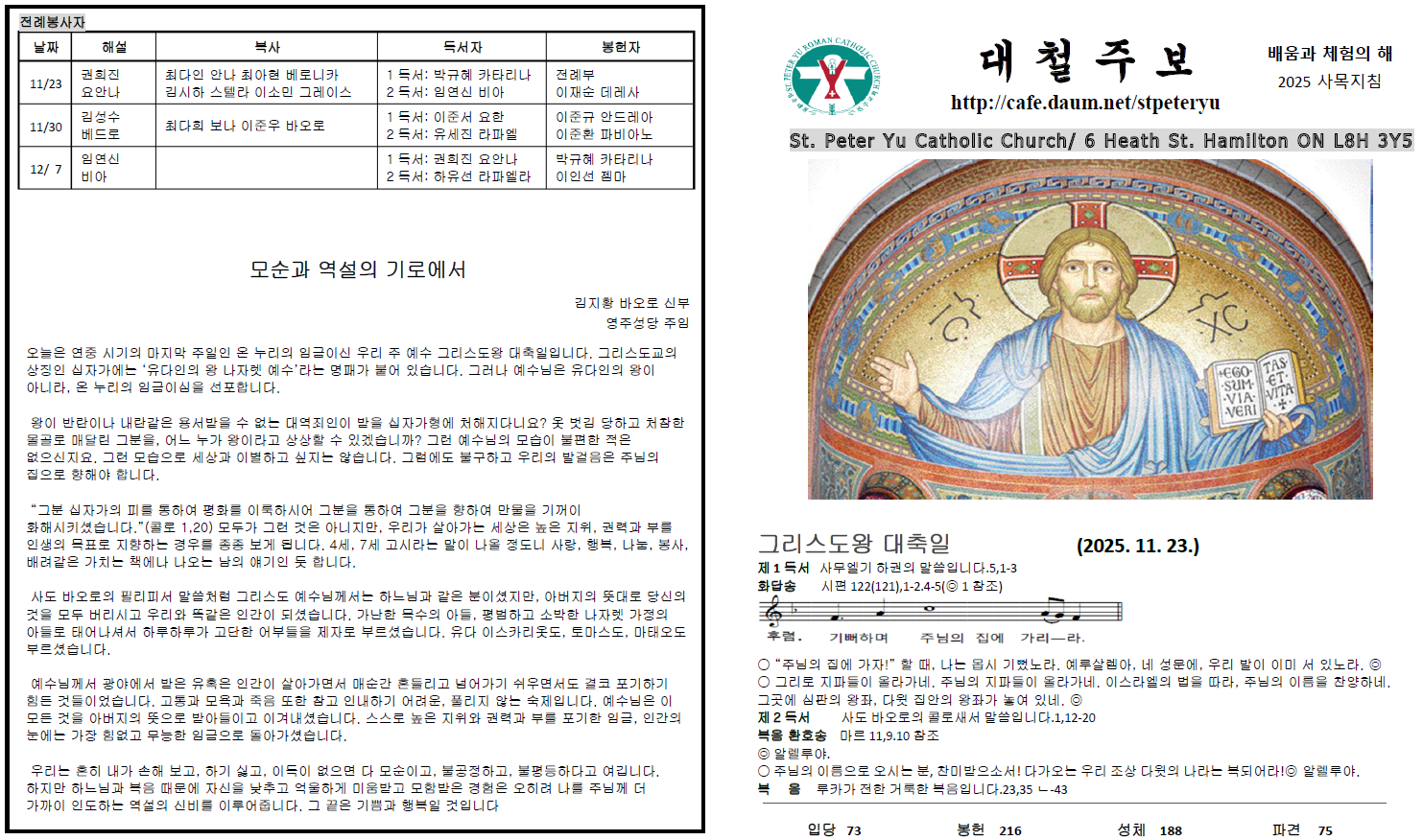 2025 48 그리스도왕 대축일(11/23) 작성자CISCO|작성시간25.11.23|조회수89 목록 댓글 0 글자크기 작게가 글자크기 크게가 2025 48 그리스도왕대축일.pdf1.01MB 첨부파일첨부된 파일이 3개 있습니다. png 파일 image.png 다운로드 png 파일 image.png 다운로드 pdf 파일 2025 48 그리스도왕대축일.pdf 다운로드 다음검색 현재 게시글 추가 기능 열기 북마크 공유하기 신고 센터로 신고 댓글 댓글 0 댓글쓰기 답글쓰기 댓글 리스트