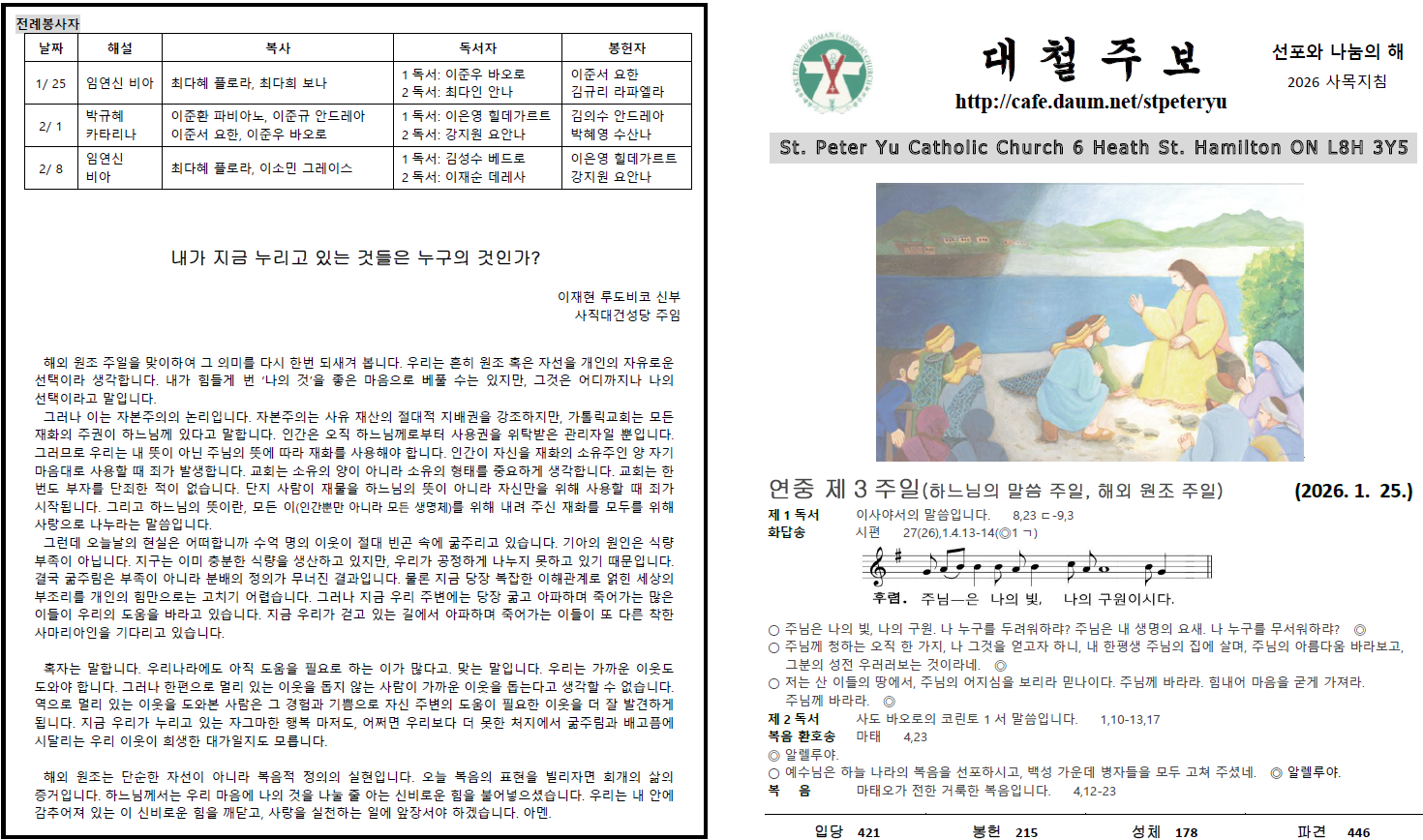 2026 5 연중 제3주일 (1/25) 작성자CISCO|작성시간26.01.25|조회수70 목록 댓글 0 글자크기 작게가 글자크기 크게가 2026 5 연중 제3주일.pdf529.95KB 첨부파일첨부된 파일이 3개 있습니다. png 파일 image.png 다운로드 png 파일 image.png 다운로드 pdf 파일 2026 5 연중 제3주일.pdf 다운로드 다음검색 현재 게시글 추가 기능 열기 북마크 공유하기 신고 센터로 신고 댓글 댓글 0 댓글쓰기 답글쓰기 댓글 리스트