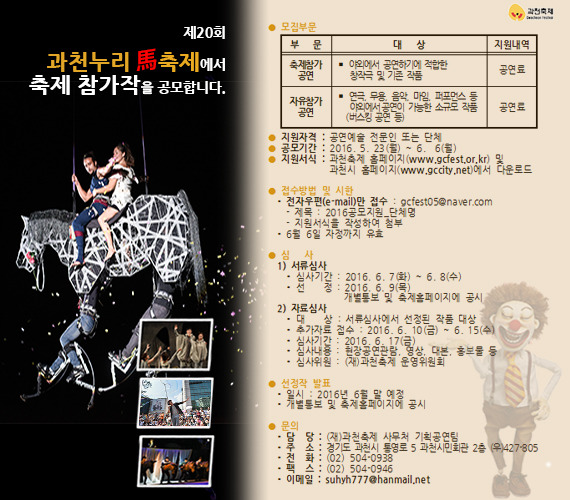 과천누리마축제 축제참가작 공모 작성자suhyoung|작성시간16.05.25|조회수77 목록 댓글 0 글자크기 작게가 글자크기 크게가 공모계획519-웹용.hwp 공모지원서.hwp 첨부파일첨부된 파일이 3개 있습니다. jpg 파일 축제참가작공모.jpg 다운로드 hwp 파일 공모계획519-웹용.hwp 다운로드 hwp 파일 공모지원서.hwp 다운로드 다음검색 현재 게시글 추가 기능 열기 북마크 공유하기 신고 센터로 신고 댓글 댓글 0 댓글쓰기 답글쓰기 댓글 리스트