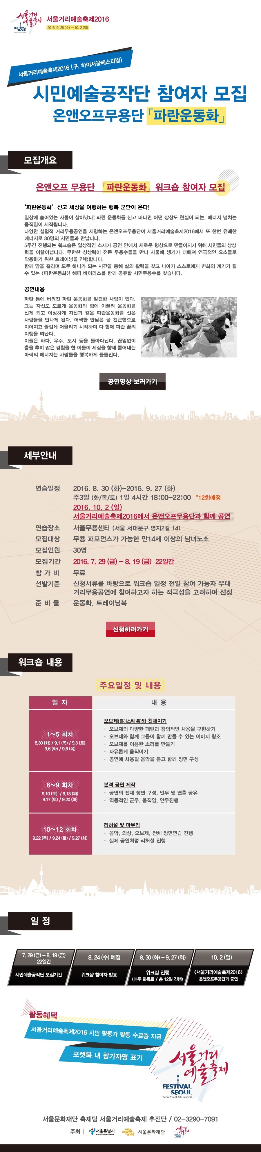 서울거리예술축제2016 시민예술공작단 참여자 모집합니다. 작성자니진|작성시간16.08.16|조회수85 목록 댓글 0 글자크기 작게가 글자크기 크게가 다음검색 현재 게시글 추가 기능 열기 북마크 공유하기 신고 센터로 신고 댓글 댓글 0 댓글쓰기 답글쓰기 댓글 리스트