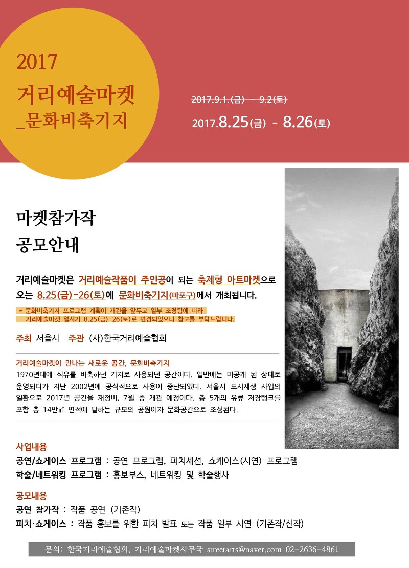 [공지] 2017 거리예술마켓_문화비축기지 참가작 공모 작성자한국거리예술협회|작성시간17.07.04|조회수84 목록 댓글 0 글자크기 작게가 글자크기 크게가 2017마켓_지원서(단체명_작품명).hwp 첨부파일첨부된 파일이 4개 있습니다. hwp 파일 2017마켓_지원서(단체명_작품명).hwp 다운로드 jpg 파일 2017마켓_웹수정1.jpg 다운로드 jpg 파일 2017마켓_웹수정2.jpg 다운로드 jpg 파일 2017마켓_웹수정3.jpg 다운로드 다음검색 현재 게시글 추가 기능 열기 북마크 공유하기 신고 센터로 신고 댓글 댓글 0 댓글쓰기 답글쓰기 댓글 리스트