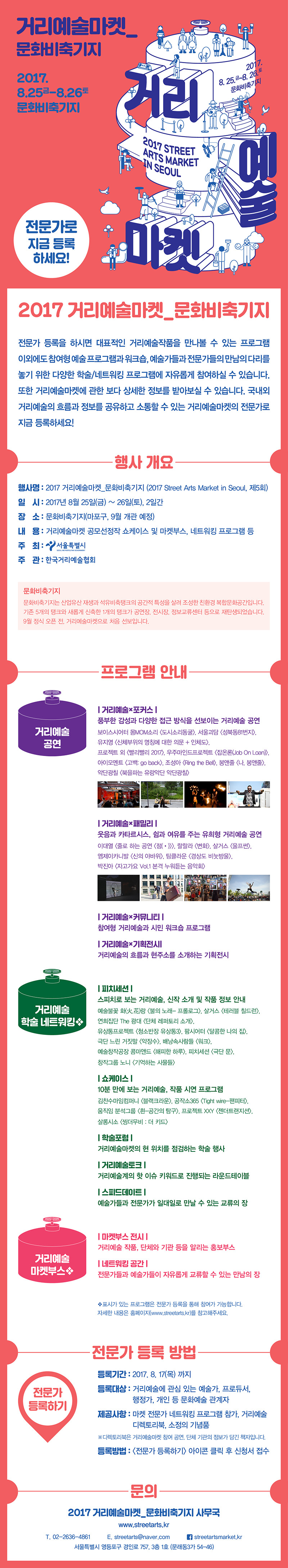 [공지] 2017 거리예술마켓_문화비축기지 전문가 등록 안내 ( ~ 8/17) 작성자한국거리예술협회|작성시간17.08.01|조회수89 목록 댓글 0 글자크기 작게가 글자크기 크게가 다음검색 현재 게시글 추가 기능 열기 북마크 공유하기 신고 센터로 신고 댓글 댓글 0 댓글쓰기 답글쓰기 댓글 리스트