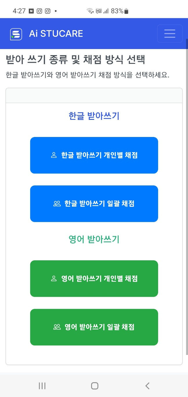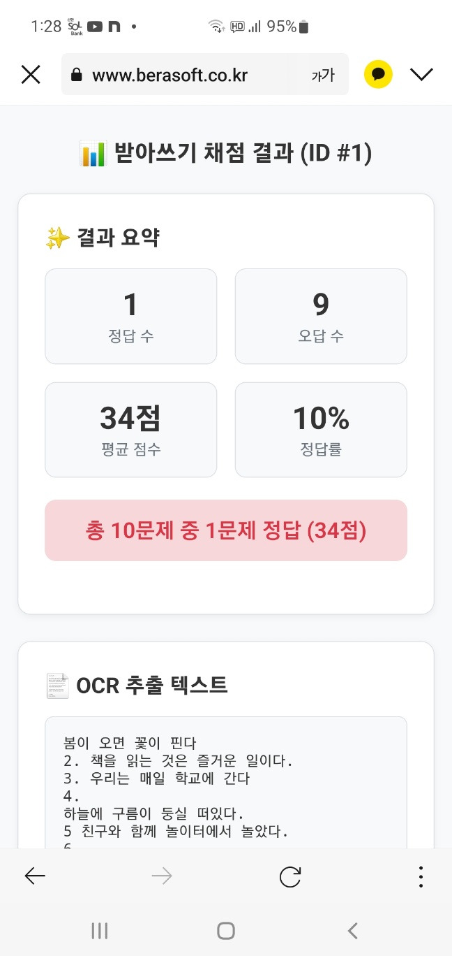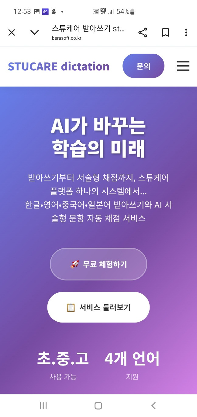 스튜케어 받아쓰기 & 서술형 채점 프로그램 소개 작성자StuCare방주인|작성시간25.06.16|조회수197 목록 댓글 0 글자크기 작게가 글자크기 크게가 초등학교를 대상으로 하는 스튜케어 받아쓰기 & 서술형 채점 프로그램을 출시할 예정입니다. 1. 다국어 받아쓰기 채점2. 서술형 문제 채점3. 생활기록부 작성 도우미 https://www.berasoft.co.kr스튜케어 받아쓰기 stucare Ai🎧 받아쓰기 채점 체험 음성을 듣고 받아쓰기를 하면, AI가 자동으로 채점하고 피드백을 제공합니다. ✅ AI 채점 기준 띄어쓰기 정확성 정확한 존대법 사용 적절한 구두점 확인 영어의 대소문자 www.berasoft.co.kr 다음검색 현재 게시글 추가 기능 열기 북마크 공유하기 신고 센터로 신고 댓글 댓글 0 댓글쓰기 답글쓰기 댓글 리스트