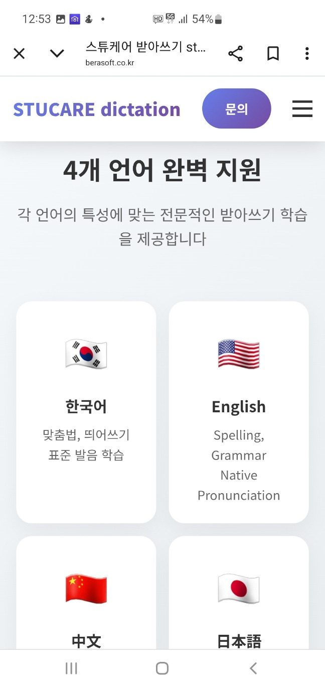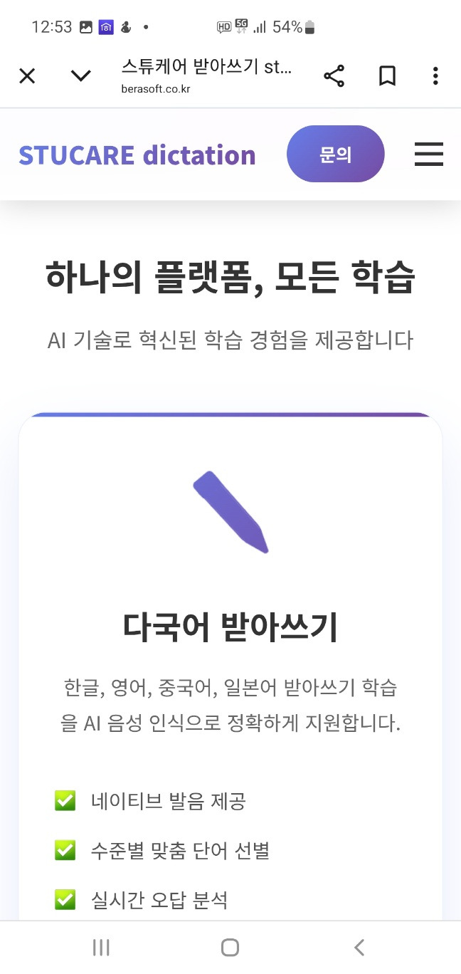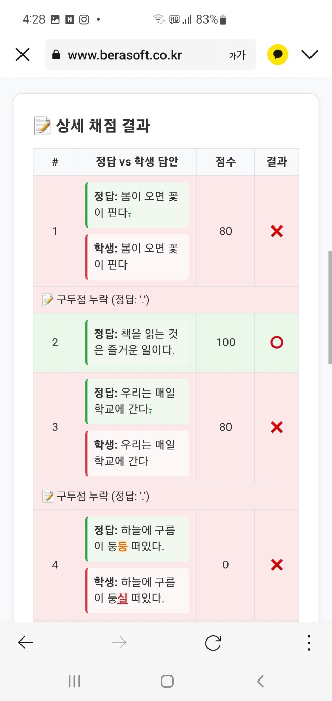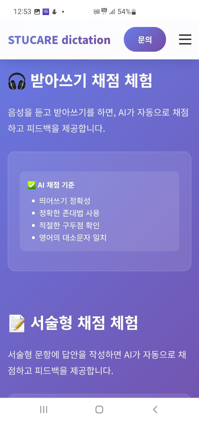 스튜케어 받아쓰기 & 서술형 채점 프로그램 소개 작성자StuCare방주인|작성시간25.06.16|조회수197 목록 댓글 0 글자크기 작게가 글자크기 크게가 초등학교를 대상으로 하는 스튜케어 받아쓰기 & 서술형 채점 프로그램을 출시할 예정입니다. 1. 다국어 받아쓰기 채점2. 서술형 문제 채점3. 생활기록부 작성 도우미 https://www.berasoft.co.kr스튜케어 받아쓰기 stucare Ai🎧 받아쓰기 채점 체험 음성을 듣고 받아쓰기를 하면, AI가 자동으로 채점하고 피드백을 제공합니다. ✅ AI 채점 기준 띄어쓰기 정확성 정확한 존대법 사용 적절한 구두점 확인 영어의 대소문자 www.berasoft.co.kr 다음검색 현재 게시글 추가 기능 열기 북마크 공유하기 신고 센터로 신고 댓글 댓글 0 댓글쓰기 답글쓰기 댓글 리스트