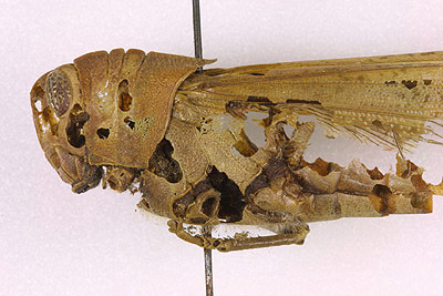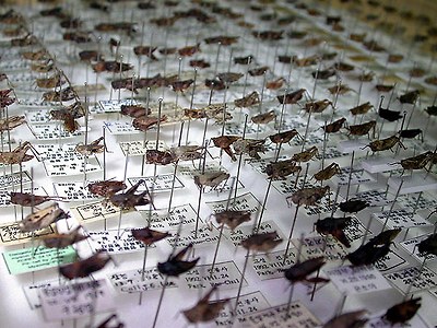 표본 먹는 해충에 의한 메뚜기 표본의 피해 표본 보관 표본을 만드는 것보다 더 중요한 것이 잘 보관하는 것이다. 메뚜기류는 살집이 많고 덩지가 커서 표본을 먹고 사는 곤충들의 공격대상으로 더할 나위 없이 좋다. 수시렁이, 표본벌레, 다듬이벌레 등이 끼지 않도록 방충제를 함께 놓아두고 정기적으로 살펴본다. 여름 장마철에 습기가 차면 표본에도 곰팡이가 피어 나기 쉽다. 방습제를 항상 같이 놓아두고 알콜 등으로 곰팡이를 닦아 제거해 준다. 어떤 표본이든 채집 장소와 날짜, 관련된 간단한 내용을 적은 라벨을 붙여 두는 것이 정보를 활용하는데 있어 매우 중요하다. |