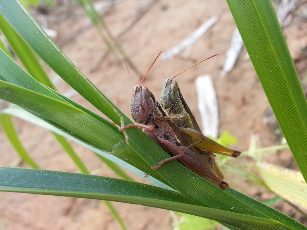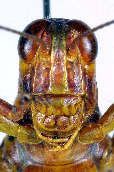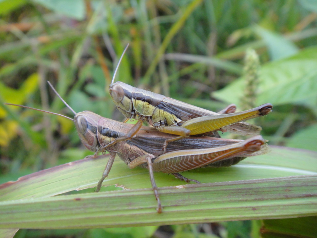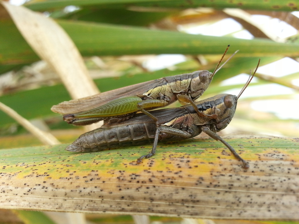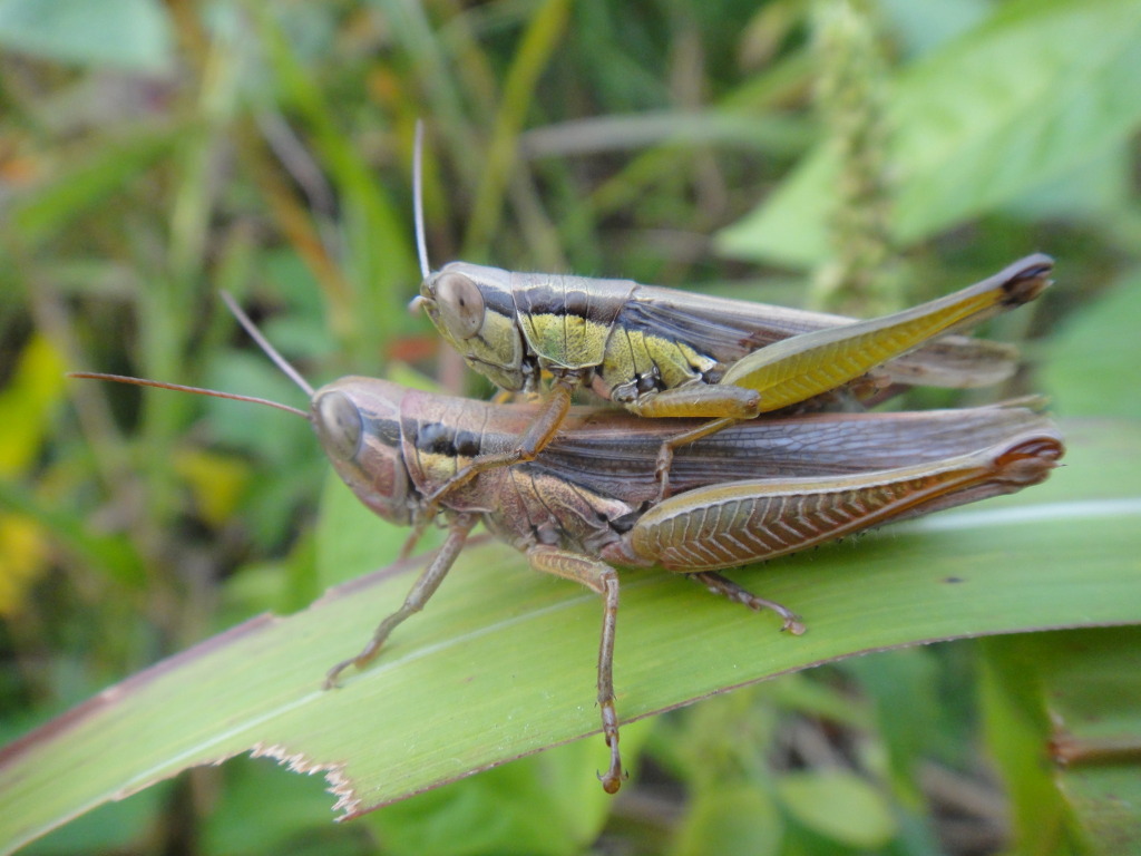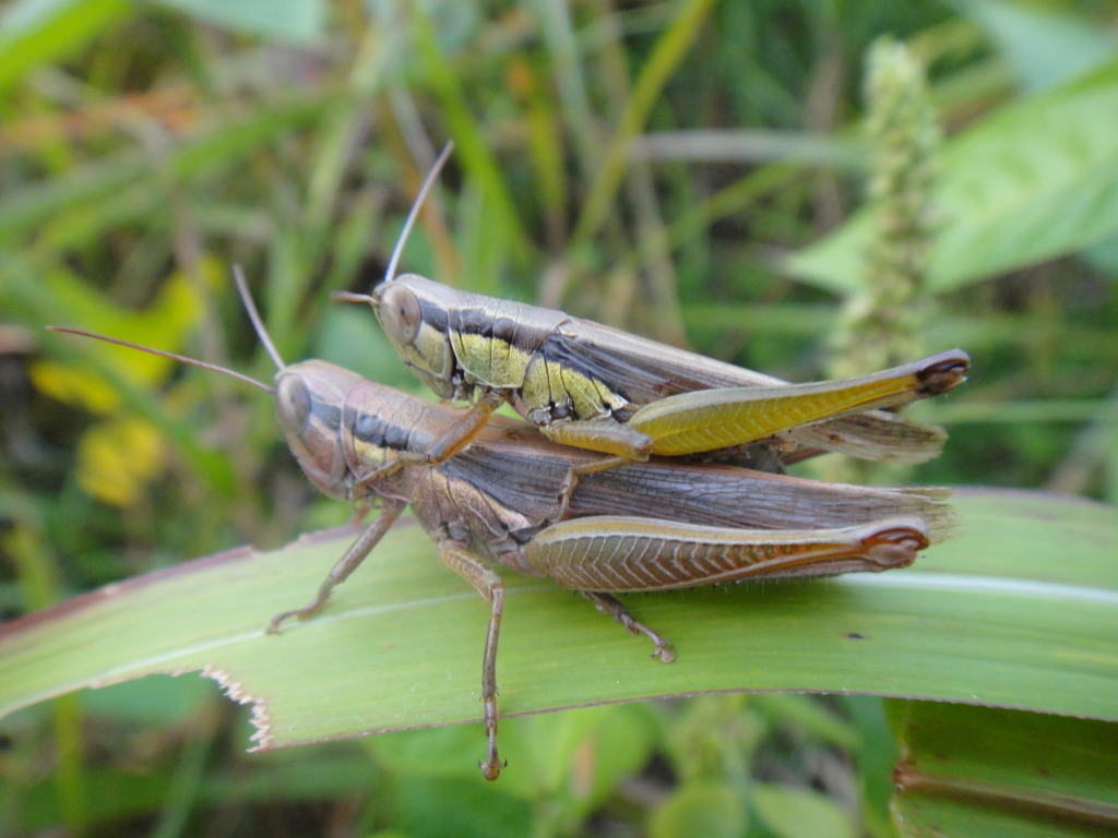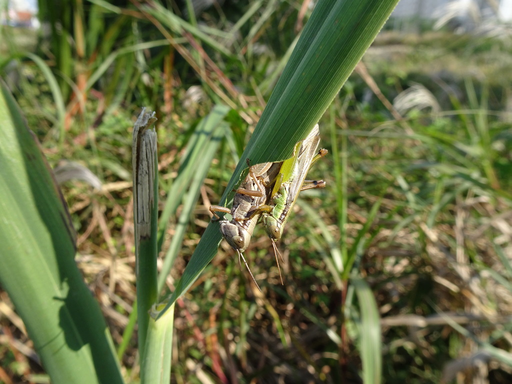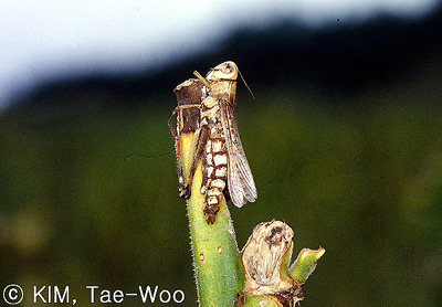 메뚜기의 색깔 메뚜기의 몸 빛깔은 대개 식물에 적응한 녹색이거나 갈색 또는 지면에 잘 어울리는 흙색이 대표적이다. 한 종에 있어서 유전적인 원인으로 갈색형 또는 녹색형이 존재하는 경우도 있으며 환경적인 영향으로 체색이 변하는 종류도 있다. 메뚜기류의 성장 과정에서 체색의 변화를 줄 수 있는 환경적인 인자로는 1) 주변의 습도, 2) 먹이의 함수량, 3) 주위 배경의 색깔, 4) 기온과 개체군 밀도 등이 있다. 대체로 개체군의 밀도가 낮고 습도가 높으면 녹색을 띠며 밀도가 높고 건조한 환경에서는 갈색을 띠는 경향이 있다. 한편 염분이 있는 염습지의 식물을 먹는 종류에서 몸 전체가 붉게 되는 경향이 있으며, 특히 늦가을 무렵이 되면 같은 종에서도 등가슴과 다리 부분이 짙은 적색으로 변하는 개체들이 나타난다. 매우 드물게 온도에 따라 카멜레온처럼 체색을 바꾸는 종도 알려져 있다. |