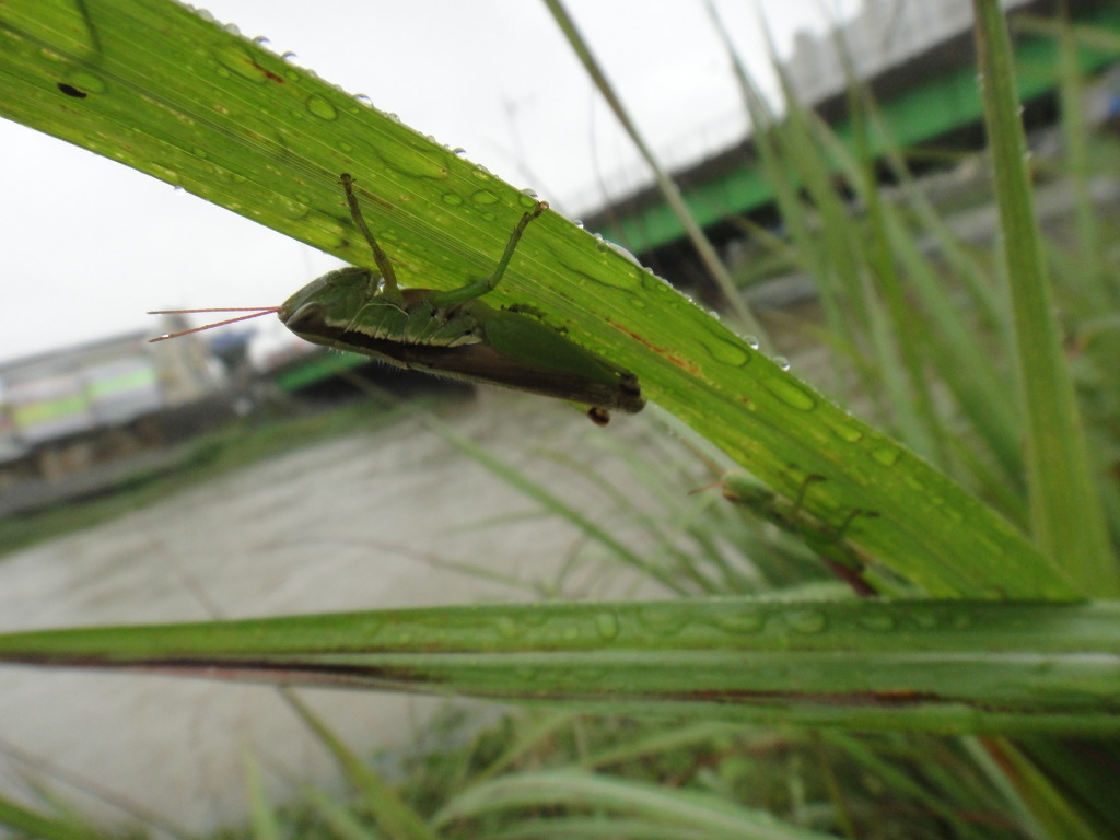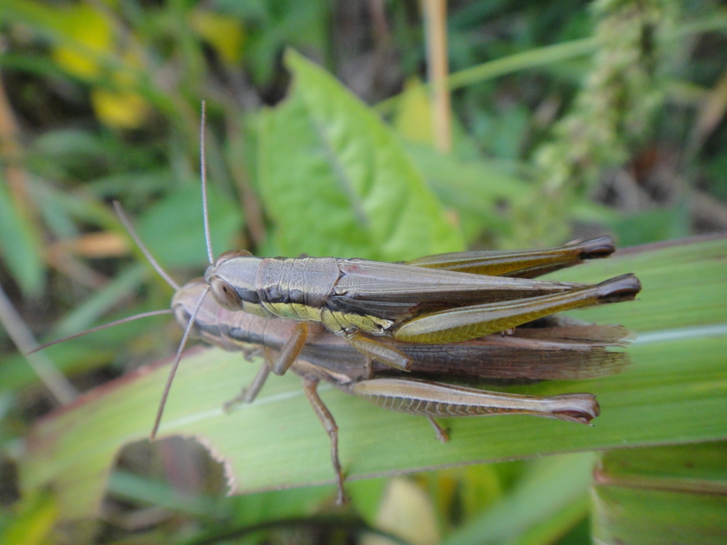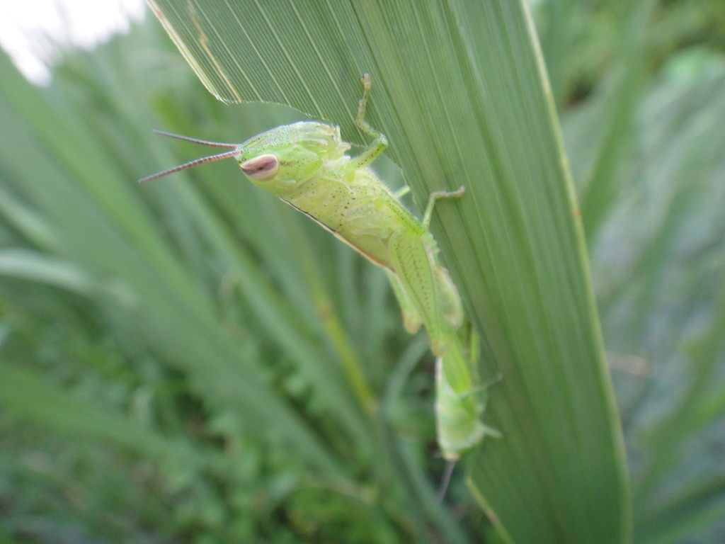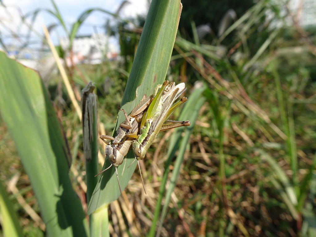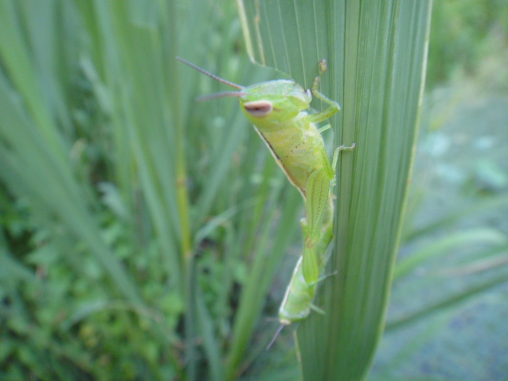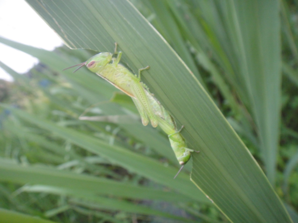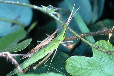 메뚜기의 색깔 메뚜기의 몸 빛깔은 대개 식물에 적응한 녹색이거나 갈색 또는 지면에 잘 어울리는 흙색이 대표적이다. 한 종에 있어서 유전적인 원인으로 갈색형 또는 녹색형이 존재하는 경우도 있으며 환경적인 영향으로 체색이 변하는 종류도 있다. 메뚜기류의 성장 과정에서 체색의 변화를 줄 수 있는 환경적인 인자로는 1) 주변의 습도, 2) 먹이의 함수량, 3) 주위 배경의 색깔, 4) 기온과 개체군 밀도 등이 있다. 대체로 개체군의 밀도가 낮고 습도가 높으면 녹색을 띠며 밀도가 높고 건조한 환경에서는 갈색을 띠는 경향이 있다. 한편 염분이 있는 염습지의 식물을 먹는 종류에서 몸 전체가 붉게 되는 경향이 있으며, 특히 늦가을 무렵이 되면 같은 종에서도 등가슴과 다리 부분이 짙은 적색으로 변하는 개체들이 나타난다. 매우 드물게 온도에 따라 카멜레온처럼 체색을 바꾸는 종도 알려져 있다. |