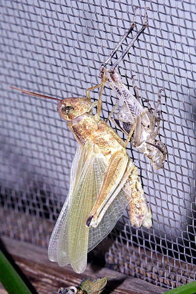메뚜기의 탈피와 우화 메뚜기는 전형적으로 번데기 시기가 없는 불완전변태를 하며 종류에 따라 보통 4-10 령의 유충 시기를 거쳐 성충이 된다. 각 영기를 거치면서 어렸을 적에 다친 부속지, 즉 더듬이나 다리 등은 조금씩 재생이 가능하다. 탈피는 일반적으로 천적을 피해 밤중에 일어나고 자신이 벗어놓은 탈피각을 먹어치움으로써 잔유 영양분을 재활용한다. 이런 행동은 잡식성인 여치, 베짱이, 귀뚜라미 등에서 나타나지만 완전 육식성인 사마귀와 초식성인 메뚜기는 자기 껍질을 풀줄기에 그냥 남겨 놓는다. 탈피와 우화 과정은 항상 비밀스럽고 조심스러우며 이 순간은 자신을 방어할 수 없는 지극히 위험한 무방비 상태이기 때문에 무척이나 신중하다. 잘못했다가 땅으로 추락하면 그대로 몸이 굳지못한 순간에 입은 타격으로 병신이 되거나 또 천적에게 쉽게 당하고 만다. 탈피를 앞둔 메뚜기는 식욕이 어느 순간 뚝 떨어지면서 단식에 들어간다. 그리고 며칠에 걸쳐 주변을 배회하다가 안전하다고 보이는 풀줄기의 위로 올라간다. 배를 씰룩거리며 호흡을 거칠게 하다가 느닷없이 자신의 발바닥을 열심히 핥기도 하는데 단단하게 부착하기 위함이다. 곤충의 탈피를 조절하는 탈피호르몬은 앞가슴샘에서부터 퍼지기 시작하므로 지역적으로 가까운 등 가슴 부분이 가장 먼저 갈라진다. 이제 탈피는 연속적으로 이루어지는데 몸 마디 전부가 팽창하여 죽죽 늘어나고 새로운 몸이 하얀 탈피각 속에서 빠져나오기 시작한다. 등, 머리, 배의 껍질이 차례로 벗겨지고 다리를 하나씩 빼 낸다. 메뚜기의 기다란 뒷다리를 빼는 순간은 아주 놀라운 장면이다. 뒷다리의 길고 굵은 넓적다리마디가 유연하게 절반으로 구부려지는 것이다. 이것은 몸이 가장 연한 상태이기 때문에 가능할 수 있다. 그리고 배끝이 아직 빠져나오지 못한 상태에서 더듬이를 빼내는데 너무 긴 종류들은 빼내기가 쉽지 않으므로 자신의 큰턱으로 조심스레 물어서 당기며 뽑아낸다. 마지막으로 배끝 또는 산란관이 빠져나오면 상황이 종료된다. 그리고 한참동안 호흡을 거칠게 한다. 이 호흡운동 역시 탈피를 도와주는 행동이다. 갓 성충이 된 메뚜기는 뒷다리를 쭉 펴고 한참을 턱걸이하는 자세로 매달려 있는데, 금방 나온 날개는 하얀 우윳빛이다. 이제 경화호르몬이 몸을 단단하게 해 주고 제 색을 갖도록 도와준다. 바닥 생활에 적응한 귀뚜라미 종류는 돌밑이나 땅위에서도 쉽게 탈피한다. 반면 몸이 커다란 여치 종류나 수상성의 메뚜기들은 풀줄기 위로 기어 올라가 중력의 도움을 받아야 허물에서 빠져나올 수 있다.