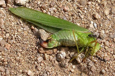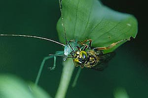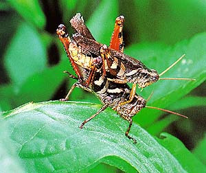 메뚜기의 천적 메뚜기는 생태계에서 먹고 먹히는 다양한 위치에 놓여 있다. 이들의 천적은 보이지 않는 병원균에서부터 사람에 이르기까지 다양하다. | ||