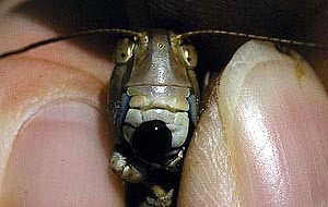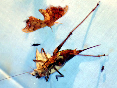 야간채집 많은 메뚜기들이 야행성이며 어떤 것은 밤이 아니면 전혀 발견하기가 어려운 종류도 있다. 특히 더듬이가 몸보다 긴 여치, 귀뚜라미 종류는 낮동안 숨어서 휴식을 취하다가 해가 떨어져야 비로소 활발한 활동을 개시하는 종류가 많다. 밤에는 짝짓기를 위해 연속적으로 울음소리를 내며 그 소리를 잘 추적하면 곤충이 숨어있는 곳을 찾아낼 수 있다. 간혹 인기척을 느끼고 울음을 중단하거나 훌쩍 뛰어 달아나기도 하지만 낮처럼 완전히 모습을 감추지는 않으며 대개 근처에서 잠시 후에 다시 울기 시작하는 경우가 많다. 보통 크게 우는 수컷의 영토 부근에는 소리에 이끌려 온 암컷도 함께 발견할 수가 있다. 야행성 곤충을 채집하기 위해서는 추적하는 사람도 이와같은 야행성 습성에 익숙해져야만 한다. 이 때는 두 손을 자유롭게 쓸 수 있도록 헤드 랜턴이나 빛이 넓게 퍼지는 보조 조명이 편리하다. |