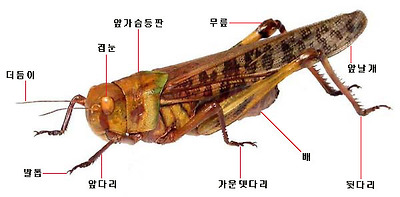 메뚜기의 형태 메뚜기의 외부형태는 곤충의 기본구조를 설명하는 예로 가장 많이 사용될만큼 대표적인 모습을 갖고 있다. 즉, 몸은 머리, 가슴, 배의 세 부분으로 뚜렷이 구별된다. 크기는 다른 곤충들에 비해 중형에서 대형급으로 쉽게 인식되며 드물게 극히 소형도 존재한다. 머리는 보통 입의 방향이 아래를 향한 하구식이며 입틀은 전형적으로 씹는 형이다. 더듬이는 대개 실모양으로 가늘고 많은 마디로 구성된다. 기본적으로 한 쌍의 커다란 겹눈과 세 개의 작은 홑눈이 있다. 앞가슴등판은 크고 뒤로 신장하여 가운데가슴과 뒷가슴을 덮는다. 날개는 가죽질의 앞날개, 즉 두텁날개와 날 때에 부채처럼 펼쳐지는 얇은 뒷날개, 두 쌍으로 구성된다. 발목마디는 보통 1-4마디로 구성되며 발톱 사이의 욕반은 풀과 나무에 붙는 종류에서는 잘 발달하나, 바닥에 앉거나 기는 종류에서는 퇴화한다. 암컷의 산란관은 잘 보이지 않게 짧거나 낫형, 단검형, 장검형, 바늘형 등으로 여러 가지가 있다. 메뚜기의 가장 큰 형태적 특징은 길고 튼튼한 뒷다리로서 뛰기, 즉 도약에 적응되어 있다. 어떤 귀뚜라미와 메뚜기는 대단한 뜀뛰기 선수로 한번에 2.3-2.6 m를 뛸 수 있으며 피로함을 나타내지 않고 계속해서 반복적인 운동도 할 수 있다. 이것이 가능한 이유는 뒷다리에 레슬린이라 불리는 단백질이 함유되어 있기 때문이며, 이것은 돌아오는 탄성 에너지의 97 %를 이용하는 놀라운 능력이 있다. 메뚜기목의 옛 이름인 'Saltatoria' 라는 단어 자체에도 뛴다는 의미가 있다. 다만 이차적으로 진화했거나 다른 기원을 가진 일부 종류는 뛰는 능력을 상실하기도 하였다. |