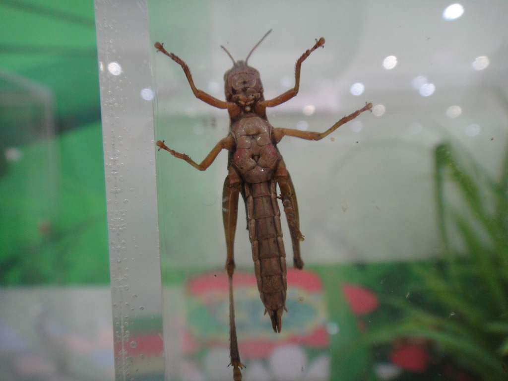 표본 제작 채집한 메뚜기는 자신의 취향이나 목적에 따라 여러 가지 방법으로 표본을 만들 수 있다. 그러나 표본 자체를 위하여 대량으로 곤충을 잡아 죽이는 것은 지양해야 할 일이다. 항상 목숨을 가진 생명체를 다룰 때는 내가 그들의 생명을 빼앗을 정당한 권리가 있는가를 생각해 보아야 한다. 목적없는 채집은 단지 살생에 지나지 않는다. 나비나 딱정벌레와 달리 메뚜기류의 큰 단점은 사후 변화가 심해 살아있을 때처럼 깨끗한 색과 모양을 유지하기가 힘들다는 것이다. 이것을 방지하기 위해서 제작된 특수 용매나 동결건조법, 수지봉입법 등이 있기도 하지만 여기서는 일반적인 방법만을 간략히 소개한다. 건조 표본 우선 메뚜기를 죽이는 방법이 중요하다. 독병 속에 곤충을 죽이는 데 사용하는 시안화물 (청산가리) 는 색을 보존하는데는 적합하지만 몸체가 뻣뻣해져서 자세를 바로 잡기가 힘들다. 반대로 에틸 아세테이트는 몸 상태는 부드럽게 유지되나 조금만 오래 두면 색이 완전히 빠져 버리는 단점이 있다. 죽은 메뚜기는 바로 피닝에 들어가는 것이 가장 이상적이며 그렇지 못한 경우가 많으므로 그 예비책을 세워야 한다. 장기간 채집 여행이 될 경우에는 특히 신경을 써서 메뚜기의 몸에서 수분이 잘 빠져나가도록 마른 종이나 휴지를 넣어주었다가 자주 갈아주어야 한다. 특히 몸이 무른 곤충은 수분이 빠져 나가면서 금새 썩어 변색되어 버린다. 바로 표본을 만들지 못할 경우에는 냉장고에 필히 보관해 두어야 한다. 메뚜기를 산 채로 가두어 두었다가 배설을 완전히 시키고 굶겨 죽이는 방법도 있으나 시간적으로, 공간적으로 많은 신경을 써야 한다. 표본을 건조시킬 때에는 주변에 습기가 없어야 표본이 썩어가는 것이 예방되므로 제습 시설이 있어야 한다. 고온의 건조기에서 오래 있으면 표본이 구워져 이상한 색이 되어 버리며 건조하기에 적합한 온도는 약 38℃이다. 메뚜기의 몸 속에서 특히 수분이 많은 내장 부위는 목 부분을 절개해서 빼 낼 수 있으며 대신 솜 같은 것으로 채우면 좋다. 표본의 자세 메뚜기류의 몸에 핀을 꼽을 때는 비교적 단단한 앞가슴등판의 좌우 어느 한 쪽에 찌른다. 곤충은 좌우대칭동물이므로 충분한 관찰을 확보하기 위해 어느 한쪽으로 치우친다. 몸이 길어서 중심을 잡기 위해 가운데 쯤의 날개에 흔히 핀을 꼽기도 하지만 날개의 중요한 특징과 이후에 날개를 펴는 경우가 있으므로 안정적인 앞가슴등판을 이용한다. 또 몸이 좌우로 납작한 여치나 메뚜기는 몸을 옆으로 뉘어 옆가슴판에 핀을 꼽기도 한다. 이것은 한 눈에 쉽게 많은 특징을 관찰하기 위한 방법이다. 전시효과를 위해 좌우 날개를 나비처럼 전시하는 경우도 있으며 한쪽 날개만 펴는 경우도 있다. 뒷날개의 무늬나 시맥 등은 중요한 특징의 일부이므로 이것을 살리는 것이 좋다. 다리는 모두 오무리거나 또는 잘 뻗도록 할 수도 있는데 이것은 개인의 목적에 맞게 다양하게 할 수 있다. 다만 많은 소팅 작업이 예상되는 경우에는 공간 면적을 줄여 서로 부딪쳐서 부속지가 떨어져 나가는 것을 방지하는 것이 낫다. 미세한 핀을 이용하여 더블 마운팅을 하거나 대지에 수용성 접착제로 직접 붙이기도 한다. 보관 면적을 줄이기 위해 핀을 꼽지 않고 자세를 잘 잡아 삼각지에 싸서 그대로 잘 보존할 수도 있다. 액침 표본 몸이 연약하고 물기가 많은 메뚜기들에게 적합하다. 보통 80% 알콜 용액과 관병이 사용된다. 건조 표본을 만드는 것보다 힘이 덜 들고 간단하다. 액침의 단점은 색이 더 쉽게 빠진다는 것인데 특히 녹색은 가장 잘 빠진다. 초기 고정시기에 Pampel's fixative을 사용하면 예방이 가능하다. 건조 표본은 마르는 과정에서 본래의 자연스런 구조가 뒤틀려 변형되기 쉬우므로 메뚜기의 암수 한 쌍씩은 액침표본해 두는 것이 원래의 변형되지 않은 구조를 살피거나 연구하는데 도움이 된다.