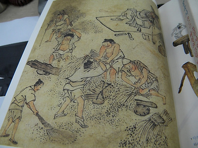 "단원의 '타작'으로 돌아가자. 중앙에는 알곡을 떨어내는 사람이 넷 있다. 왼쪽 구석에는 떨어진 알곡을 쓸어 모으는 사람이 있고 왼쪽 위에는 볏단을 지게에 진 사람이 있다.