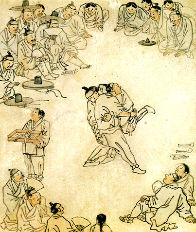 크게 장이 서고, 단오나 크게 행사가 벌어지면 그 자리에 빠지지않고 등장한 것이 바로 씨름이다. 지금은 프로 선수들의 스포츠로 자리를 잡았지만, 예전에는 동네에서 힘깨나 쓴다는 사람들은 모두 씨름에 출전을 했고, 그중의 누군가는 소를 상금으로 타고는 해서 마을 사람들의 부러움을 사기도 했다. 이런 씨름의 풍경은 민중들의 삶을 그린 김홍도의 화폭에도 기록되었다. 단원(檀園) 김홍도의 「씨름도」는 단원의 대표적인 풍속화첩인 「단원풍속도첩」에 속한 잘 알려진 명품 중에 하나다.