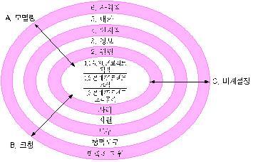 ㉠전통적 거시적 모형과는 달리 분명한 시작과 끝이 없다. 대신에 세 가지 주요 초점 사이의 끝없는 상호작용이 존재하며 동일한 이슈가 여기저기에서 여러 번 언급되고 있기 때문에 순환 반복적이다.