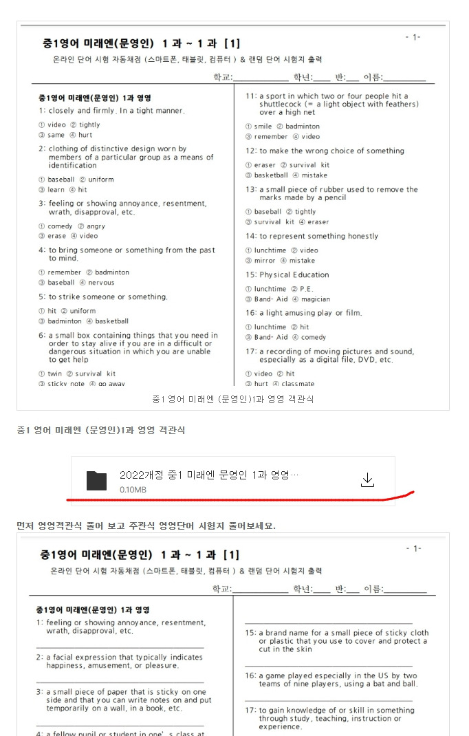 [영어단어]2022 개정 중1 미래엔 문영인 영영단어시험지 작성자영어단어장 애니보카(anyvoca)|작성시간25.02.24|조회수94 목록 댓글 0 글자크기 작게가 글자크기 크게가 2022개정 중1 미래엔 문영인 영영단어시험지 2022개정 중1 미래엔 문영인 영영단어시험지 https://wordtest.tistory.com/entry/2022%EB%85%84-%EA%B0%9C%EC%A0%95-%EC%A4%911%EC%98%81%EC%96%B4-%EB%AF%B8%EB%9E%98%EC%97%94%EB%AC%B8%EC%98%81%EC%9D%B8-%EA%B3%BC%EB%B3%84-%EC%98%81%EC%98%81%EB%8B%A8%EC%96%B4%EC%8B%9C%ED%97%98%EC%A7%802022년 개정 중1영어 미래엔(문영인) 과별 영영단어시험지매번 출력시 랜덤 옵션으로 출력하기에 나중에 정답지를 출력해도 순서가 달라서 사용불가영한 주관식영한 객관식한영 주관식한영 앞글자 힌트 주관식한영 객관식영영 주관식영영 객관식 wordtest.tistory.com 다음검색 현재 게시글 추가 기능 열기 북마크 공유하기 신고 센터로 신고 댓글 댓글 0 댓글쓰기 답글쓰기 댓글 리스트