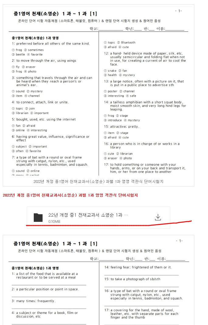[영어단어]2022 개정 중1 천재교과서 소영순 영영단어시험지 작성자영어단어장 애니보카(anyvoca)|작성시간25.02.24|조회수268 목록 댓글 0 글자크기 작게가 글자크기 크게가 2022 개정 중1 천재교과서 소영순 영영단어시험지2022개정 중1 천재교과서 소영순 영영단어시험지 2022개정 중1 천재교과서 소영순 영영단어시험지 https://wordtest.tistory.com/entry/2022%EB%85%84-%EA%B0%9C%EC%A0%95-%EC%A4%911%EC%98%81%EC%96%B4-%EC%B2%9C%EC%9E%AC%EA%B5%90%EA%B3%BC%EC%84%9C%EC%86%8C%EC%98%81%EC%88%9C-%EA%B3%BC%EB%B3%84-%EC%98%81%EC%98%81%EB%8B%A8%EC%96%B4%EC%8B%9C%ED%97%98%EC%A7%802022년 개정 중1영어 천재교과서(소영순) 과별 영영단어시험지매번 출력시 랜덤 옵션으로 출력하기에 나중에 정답지를 출력해도 순서가 달라서 사용불가영한 주관식영한 객관식한영 주관식한영 앞글자 힌트 주관식한영 객관식영영 주관식영영 객관식 wordtest.tistory.com 다음검색 현재 게시글 추가 기능 열기 북마크 공유하기 신고 센터로 신고 댓글 댓글 0 댓글쓰기 답글쓰기 댓글 리스트
