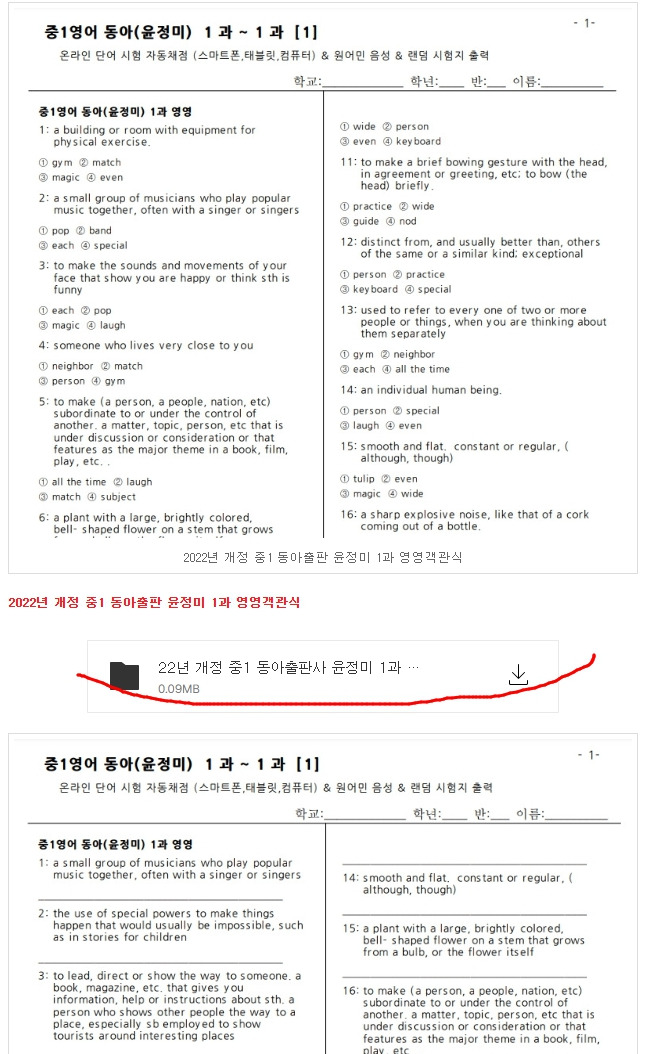 [영어단어]2022 개정 중1 동아출판 윤정미 영영단어시험지 작성자영어단어장 애니보카(anyvoca)|작성시간25.02.24|조회수543 목록 댓글 0 글자크기 작게가 글자크기 크게가 2022 개정 중1 동아출판 윤정미 영영단어시험지2022 개정 중1 동아출판 윤정미 영영단어시험지2022 개정 중1 동아출판 윤정미 영영단어시험지https://wordtest.tistory.com/entry/2022%EB%85%84-%EA%B0%9C%EC%A0%95-%EC%A4%911-%EB%8F%99%EC%95%84%EC%B6%9C%ED%8C%90-%EC%9C%A4%EC%A0%95%EB%AF%B8-1%EA%B3%BC-8%EA%B3%BC-%EB%8B%A8%EC%96%B4%EC%8B%9C%ED%97%98%EC%A7%802022년 개정 중1 동아출판 윤정미 1과~ 8과 단어시험지매번 출력시 랜덤 옵션으로 출력하기에 나중에 정답지를 출력해도 순서가 달라서 사용불가영한 주관식영한 객관식한영 주관식한영 앞글자 힌트 주관식한영 객관식영영 주관식영영 객관식 wordtest.tistory.com 다음검색 현재 게시글 추가 기능 열기 북마크 공유하기 신고 센터로 신고 댓글 댓글 0 댓글쓰기 답글쓰기 댓글 리스트