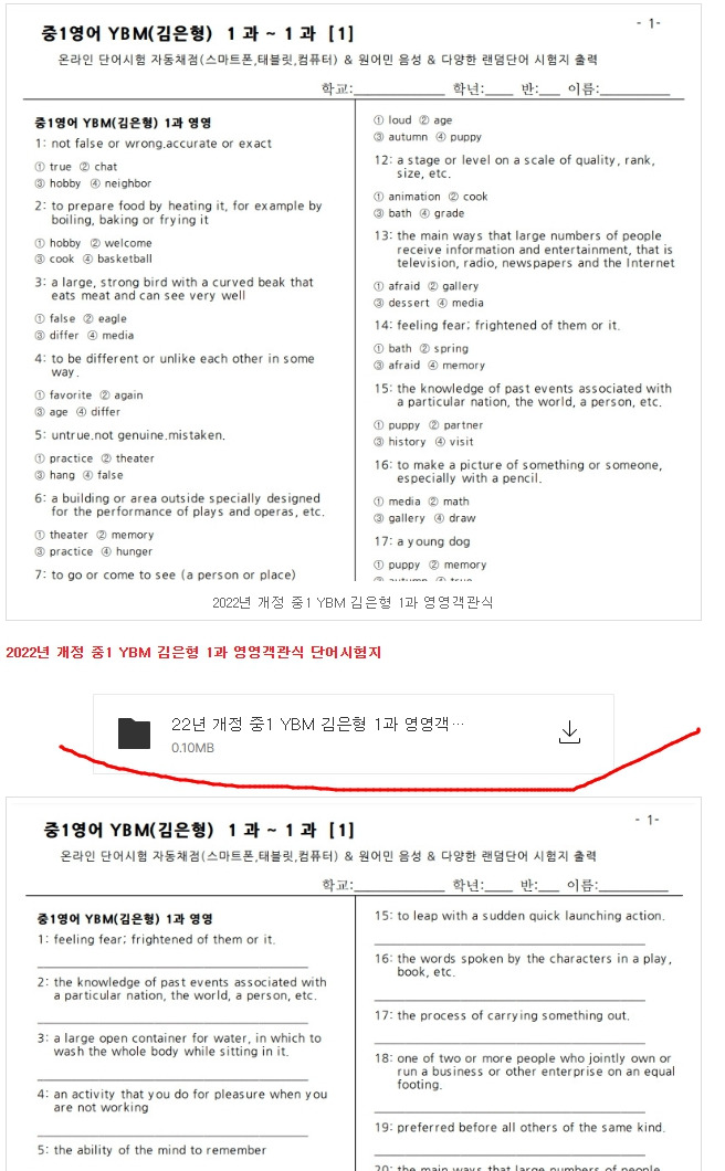 [영어단어]2022 개정 중1 YBM 김은형 영영단어시험지 작성자영어단어장 애니보카(anyvoca)|작성시간25.02.24|조회수34 목록 댓글 0 글자크기 작게가 글자크기 크게가 2022 개정 중1 YBM 김은형 영영단어시험지2022 개정 중1 YBM 김은형 영영단어시험지2022 개정 중1 YBM 김은형 영영단어시험지https://wordtest.tistory.com/entry/2022%EB%85%84-%EA%B0%9C%EC%A0%95-%EC%A4%911-YBM-%EA%B9%80%EC%9D%80%ED%98%95-1%EA%B3%BC-8%EA%B3%BC-%EB%8B%A8%EC%96%B4%EC%8B%9C%ED%97%98%EC%A7%802022년 개정 중1 YBM 김은형 1과 ~ 8과 단어시험지매번 출력시 랜덤 옵션으로 출력하기에 나중에 정답지를 출력해도 순서가 달라서 사용불가영한 주관식영한 객관식한영 주관식한영 앞글자 힌트 주관식한영 객관식영영 주관식영영 객관식 wordtest.tistory.com 다음검색 현재 게시글 추가 기능 열기 북마크 공유하기 신고 센터로 신고 댓글 댓글 0 댓글쓰기 답글쓰기 댓글 리스트