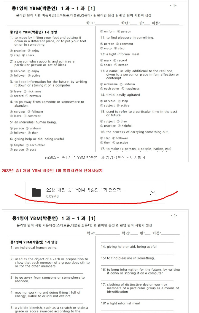 [영어단어]2022 개정 중1 YBM 박준언 영영단어시험지 작성자영어단어장 애니보카(anyvoca)|작성시간25.02.24|조회수45 목록 댓글 0 글자크기 작게가 글자크기 크게가 2022 개정 중1 YBM 박준언 영영단어시험지2022 개정 중1 YBM 박준언 영영단어시험지 2022 개정 중1 YBM 박준언 영영단어시험지 https://wordtest.tistory.com/entry/2022%EB%85%84-%EA%B0%9C%EC%A0%95-%EC%A4%911-YBM-%EB%B0%95%EC%A4%80%EC%96%B8-1%EA%B3%BC-8%EA%B3%BC-%EC%98%81%EC%98%81%EB%8B%A8%EC%96%B4%EC%8B%9C%ED%97%98%EC%A7%802022년 개정 중1 YBM 박준언 1과 ~8과 영영단어시험지매번 출력시 랜덤 옵션으로 출력하기에 나중에 정답지를 출력해도 순서가 달라서 사용불가영한 주관식영한 객관식한영 주관식한영 앞글자 힌트 주관식한영 객관식영영 주관식영영 객관식 wordtest.tistory.com 다음검색 현재 게시글 추가 기능 열기 북마크 공유하기 신고 센터로 신고 댓글 댓글 0 댓글쓰기 답글쓰기 댓글 리스트