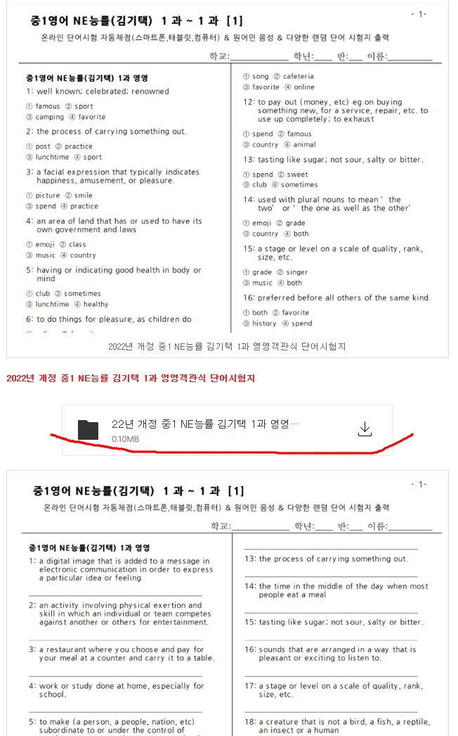 [영어단어]2022 개정 중1 NE능률 김기택 영영단어시험지 작성자영어단어장 애니보카(anyvoca)|작성시간25.02.24|조회수44 목록 댓글 0 글자크기 작게가 글자크기 크게가 2022 개정 중1 NE능률 김기택 영영단어시험지2022 개정 중1 NE능률 김기택 영영단어시험지2022 개정 중1 NE능률 김기택 영영단어시험지https://wordtest.tistory.com/entry/2022%EB%85%84-%EA%B0%9C%EC%A0%95-%EC%A4%911-NE%EB%8A%A5%EB%A5%A0-%EA%B9%80%EA%B8%B0%ED%83%9D-1%EA%B3%BC-8%EA%B3%BC-%EB%8B%A8%EC%96%B4%EC%8B%9C%ED%97%98%EC%A7%802022년 개정 중1 NE능률 김기택 1과 ~8과 단어시험지매번 출력시 랜덤 옵션으로 출력하기에 나중에 정답지를 출력해도 순서가 달라서 사용불가영한 주관식영한 객관식한영 주관식한영 앞글자 힌트 주관식한영 객관식영영 주관식영영 객관식 wordtest.tistory.com 다음검색 현재 게시글 추가 기능 열기 북마크 공유하기 신고 센터로 신고 댓글 댓글 0 댓글쓰기 답글쓰기 댓글 리스트