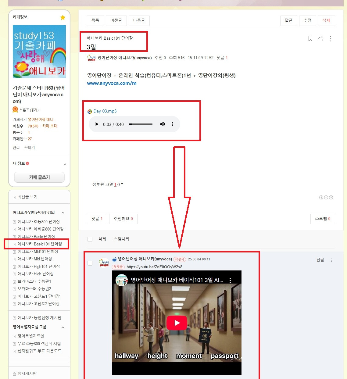 베이직101 ( 앞으로 미드 101, 하이 101 게시판 댓글창에 연결 예정) 영어단어장 day별 큐알 코드를 스캔하면 위 그림과 같이 원어민 음성 듣기가 영어단어장 순서대로 듣기 가능합니다.
