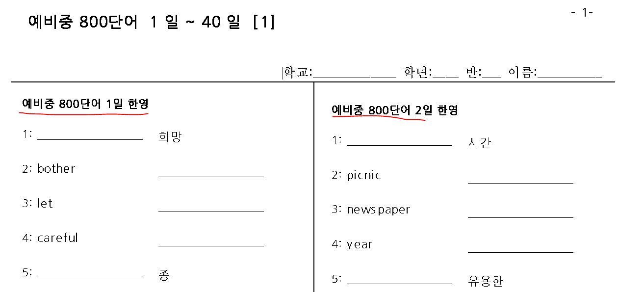 예비중800단어장 빈칸넣기 단어 시험지 입니다. 하단부 첨부 파일 받아가세요.