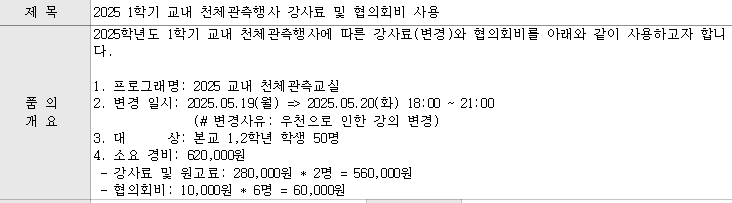 교내 천체관측행사 품의 예시안을 공유해 봅니다.