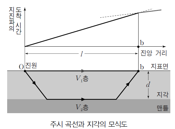 위 그림은 주시곡선을 이용하여 지각의 두께를 구하는 과정에 이용되는 것입니다. 보통 이런식으로 많이 표현하는데